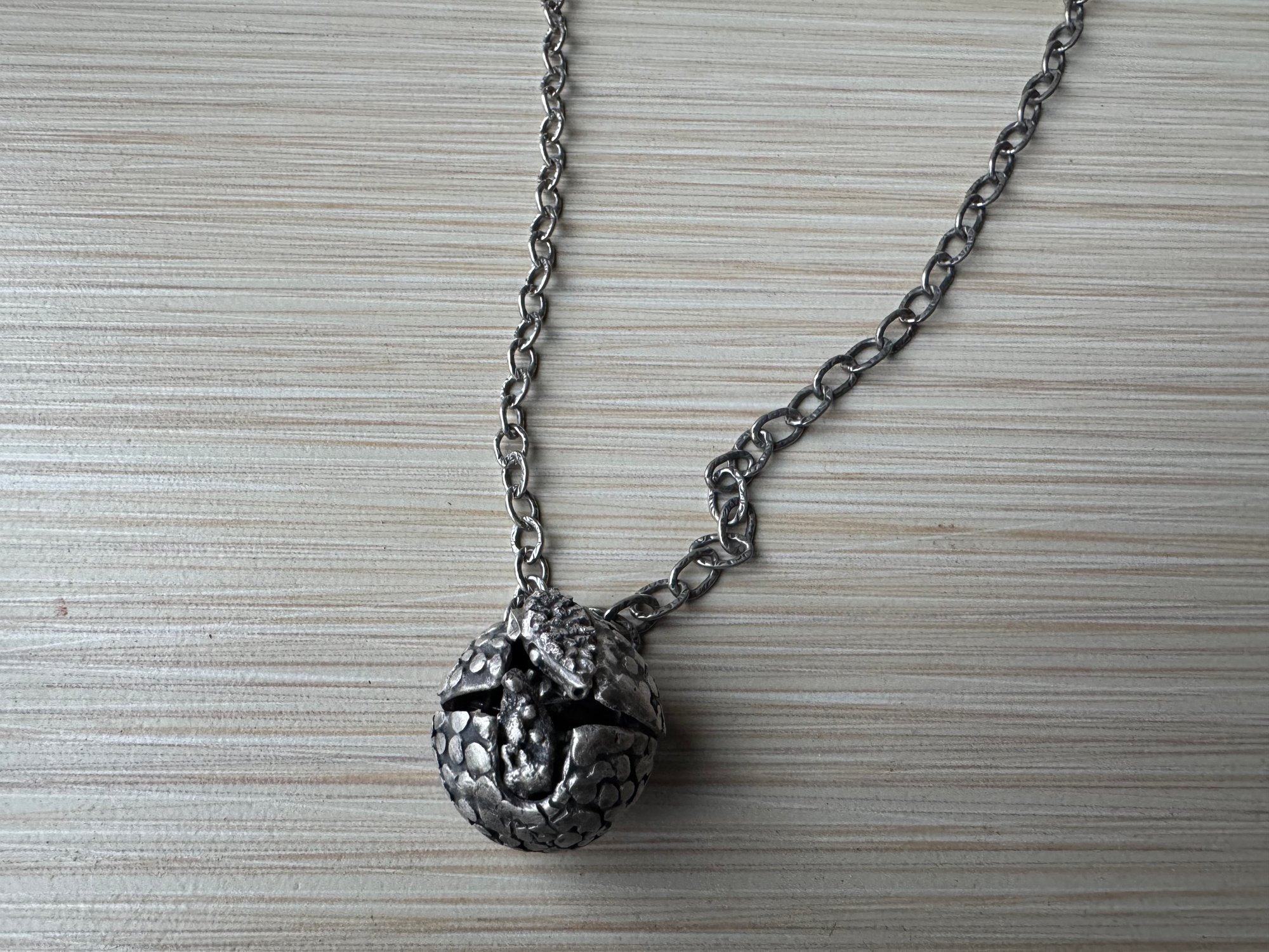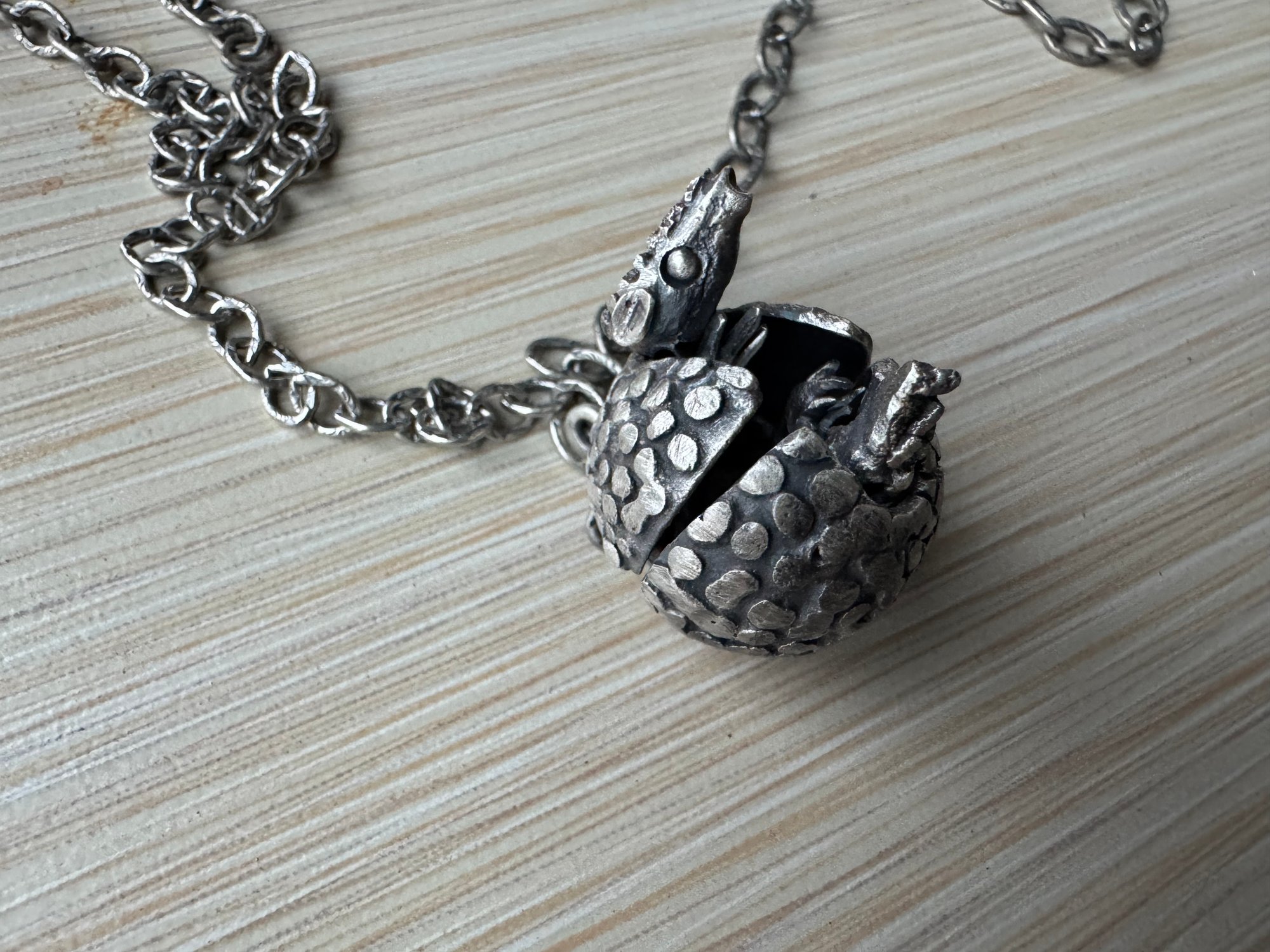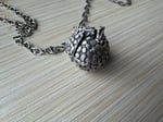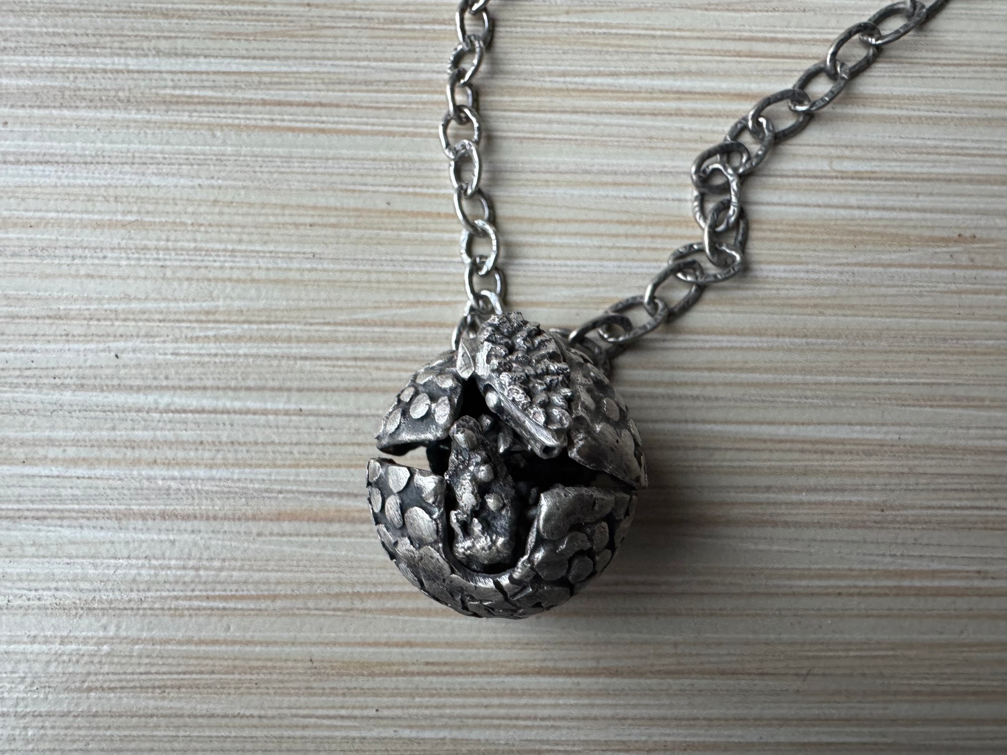 Armani is 1" round when in defense mode. He hangs on a sterling silver chain that is 18-22" in length.