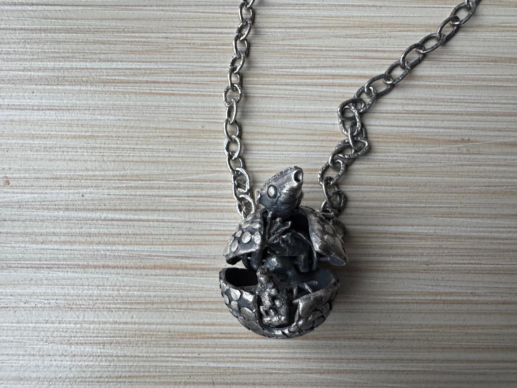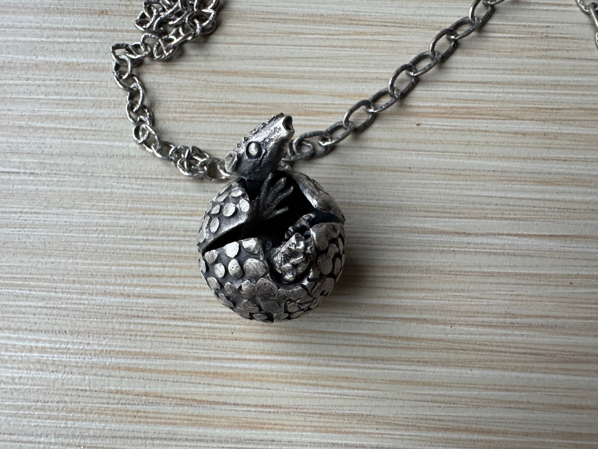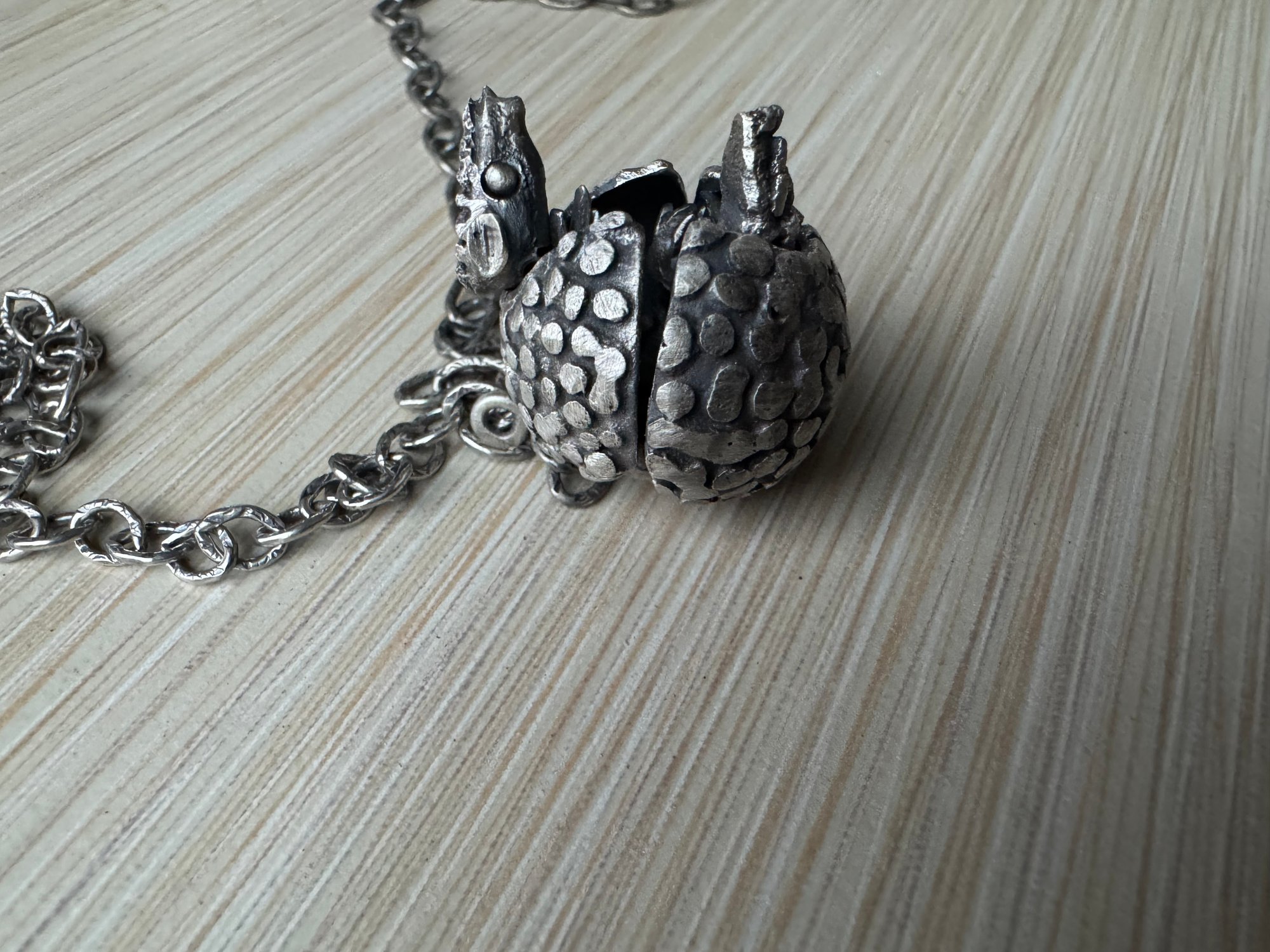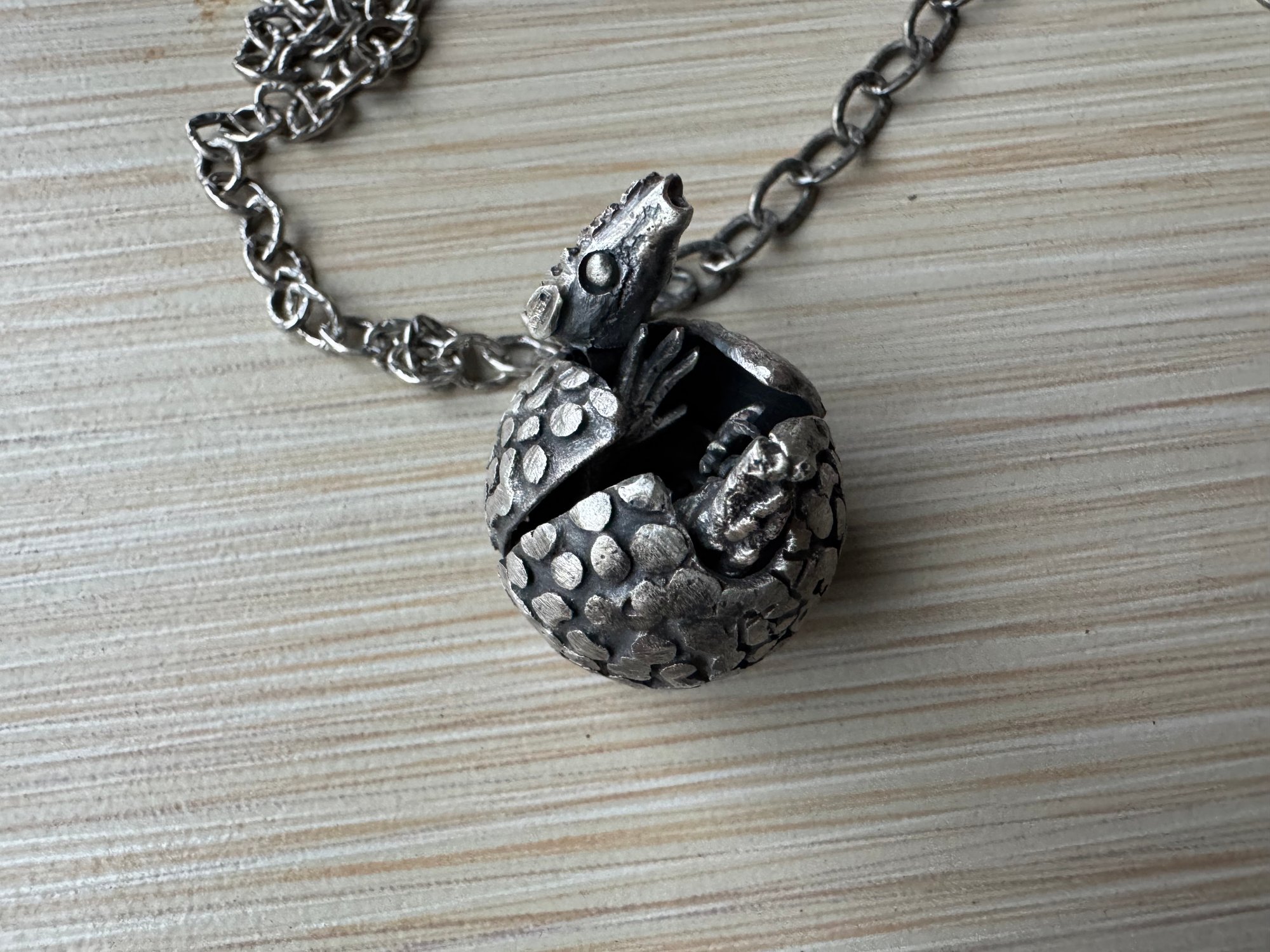 Armani is 1" round when in defense mode. He hangs on a sterling silver chain that is 18-22" in length.