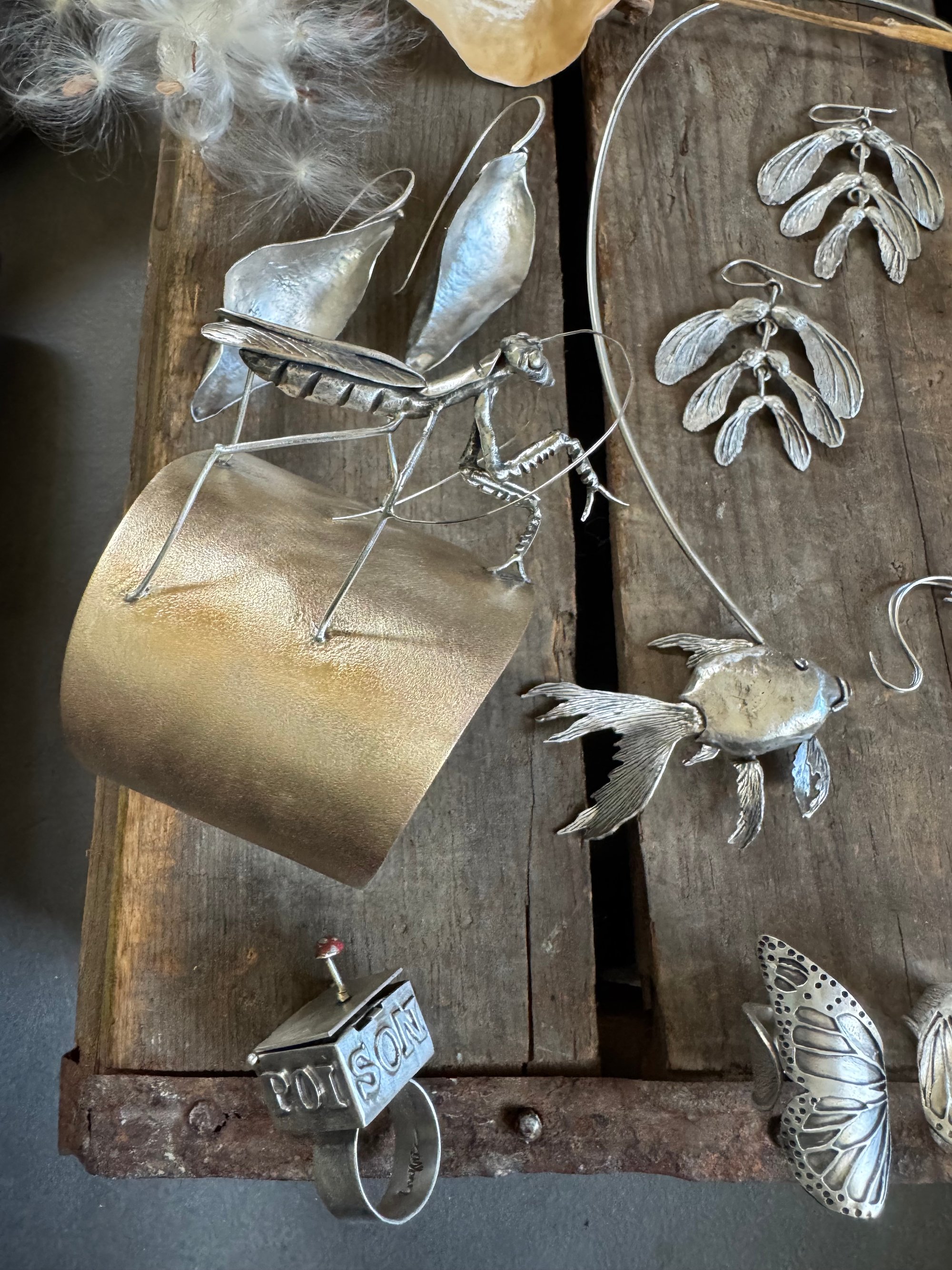 Made with brass and sterling silver. Atlantis is hand forged with sterling sterling. Techniques included sawing, fusing, soldering, forming, and carving.