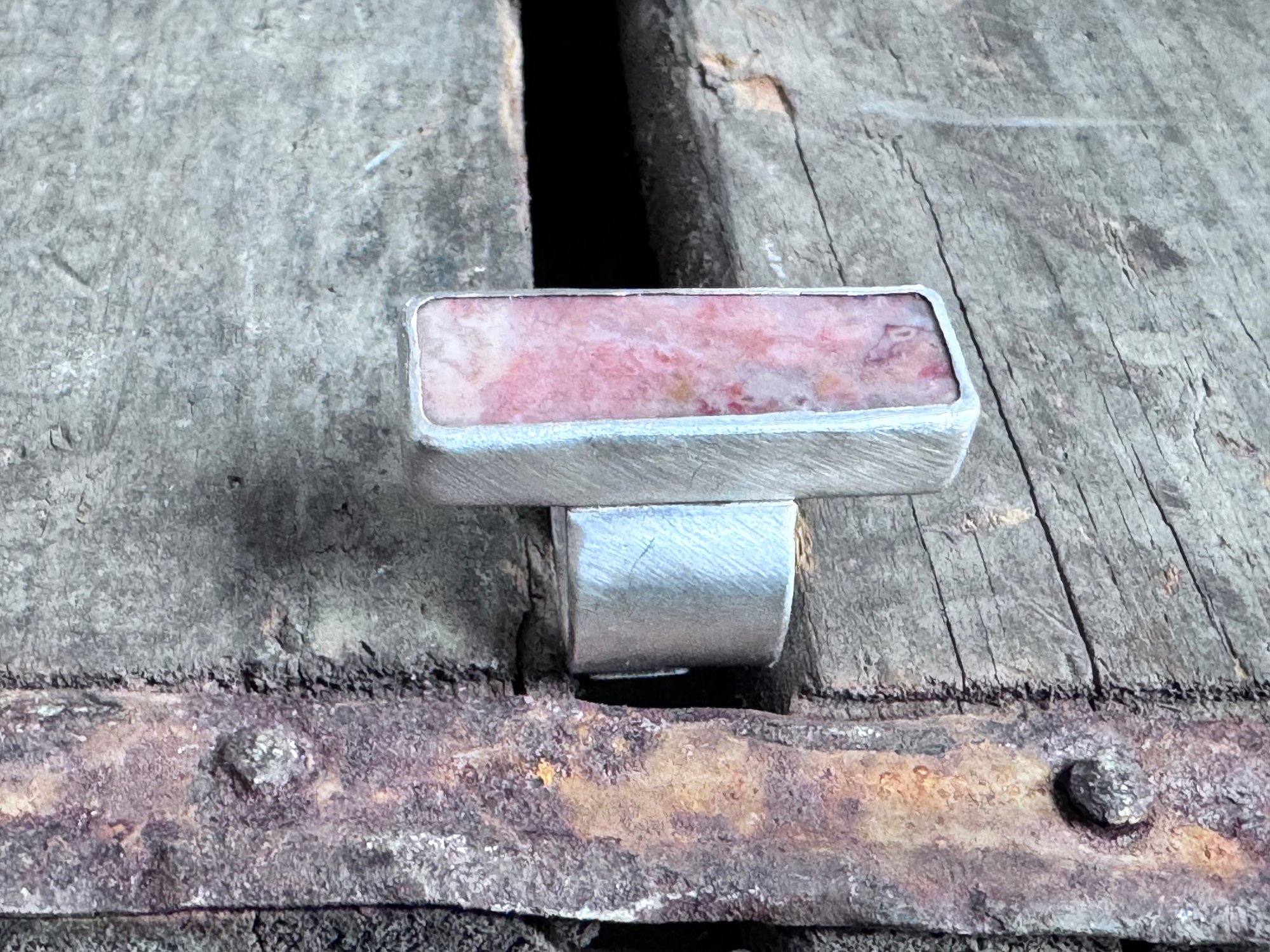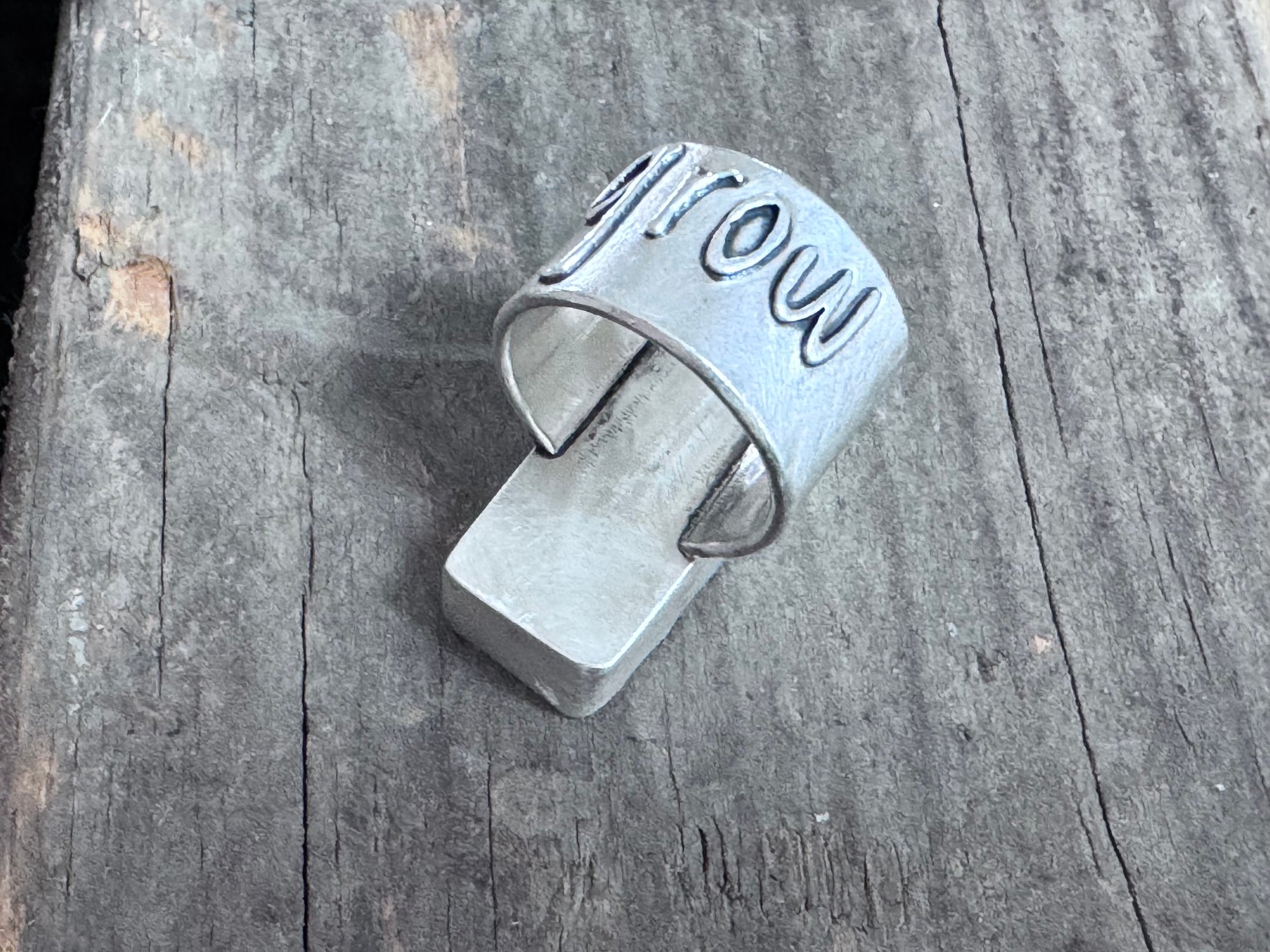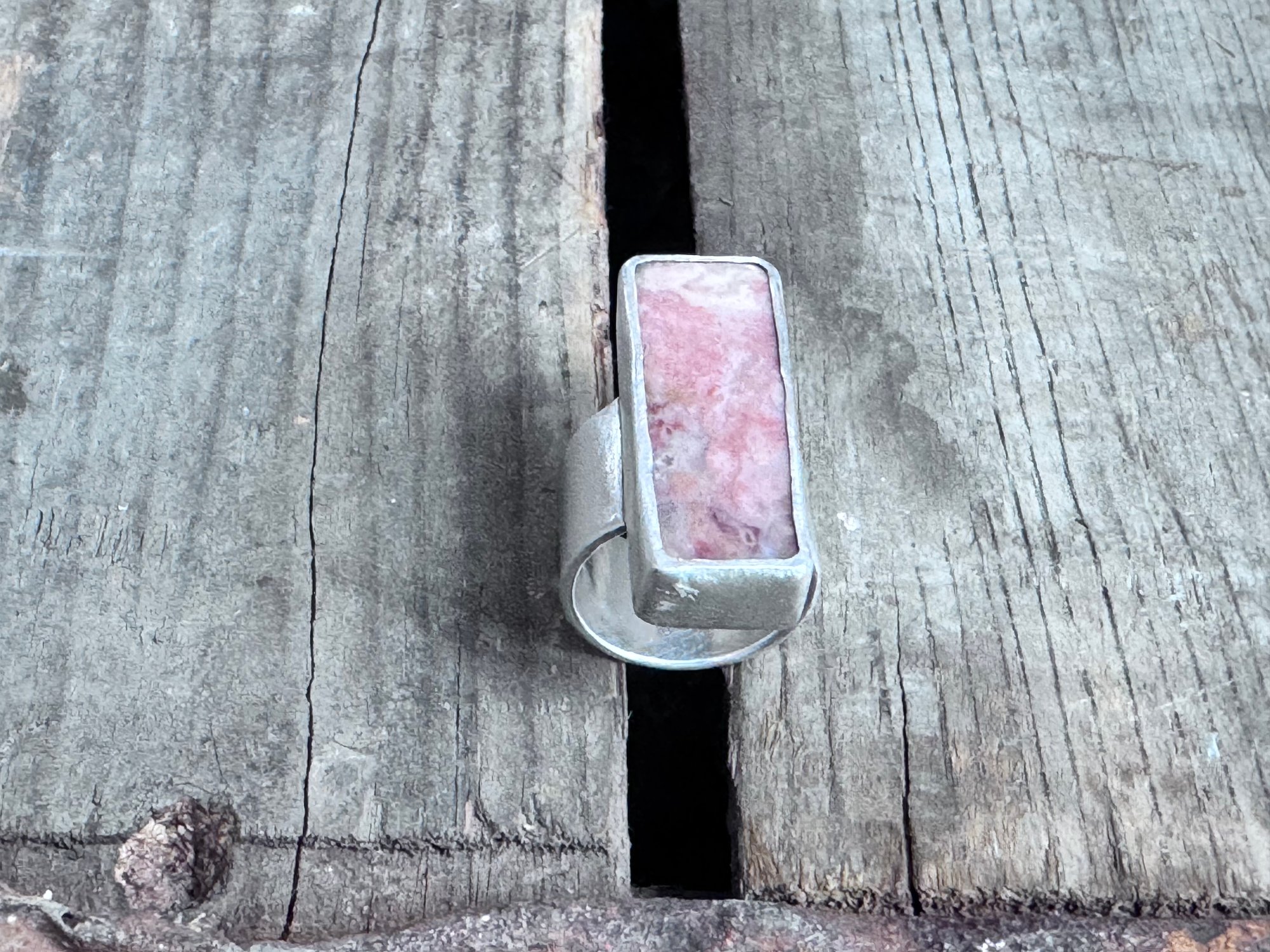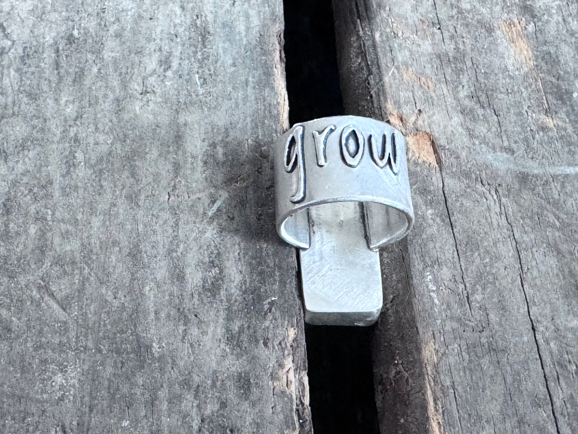 This is an exquisite piece of natural pink granite found in Washington state, now framed by a simple bezel setting. The ring shank embraces the word "grow", symbolizing the newness of spring. It reminds me of shooting stars in the spring nestled within the sage brush, and hopeful things to come.
