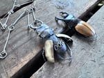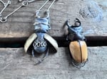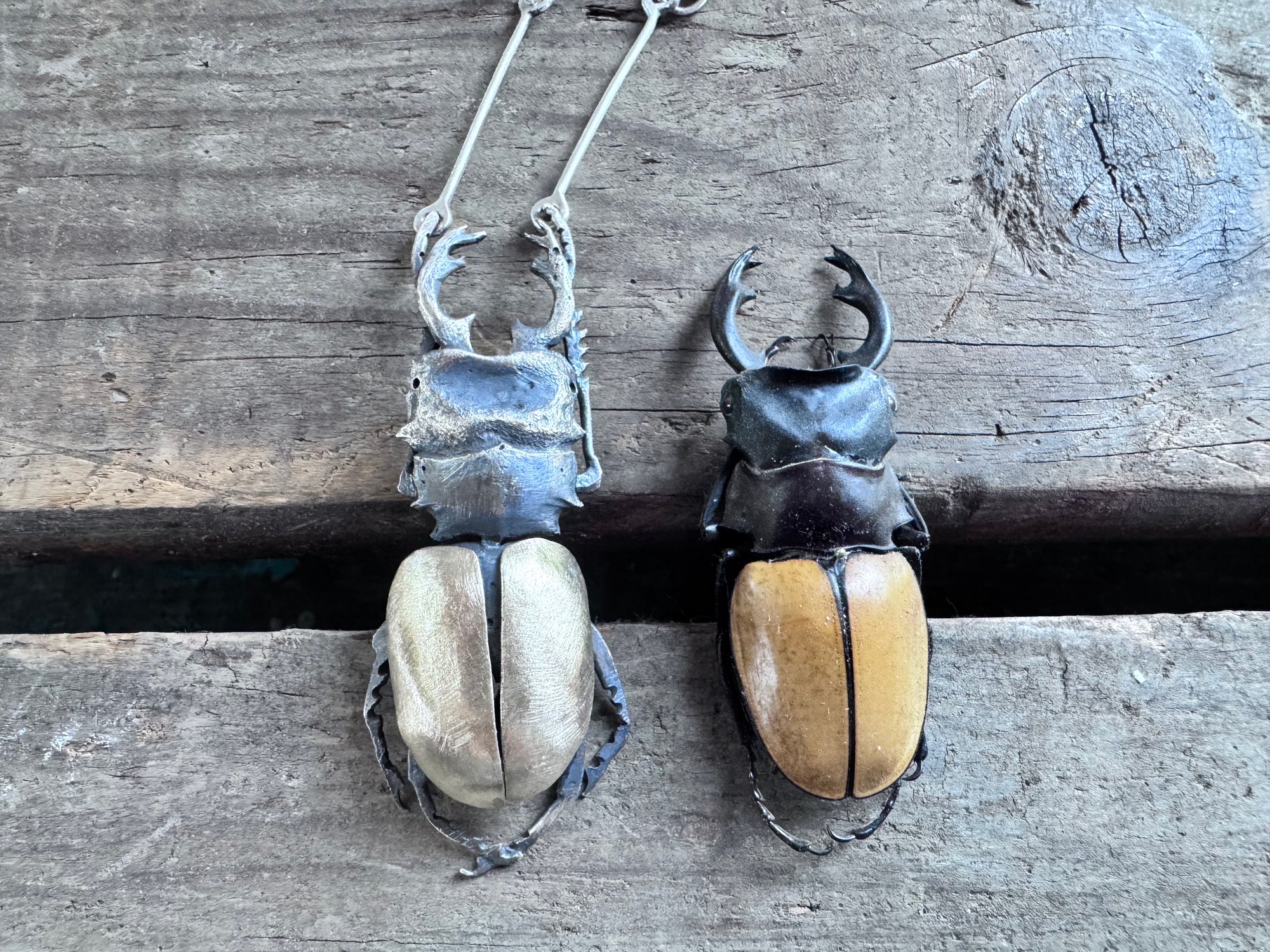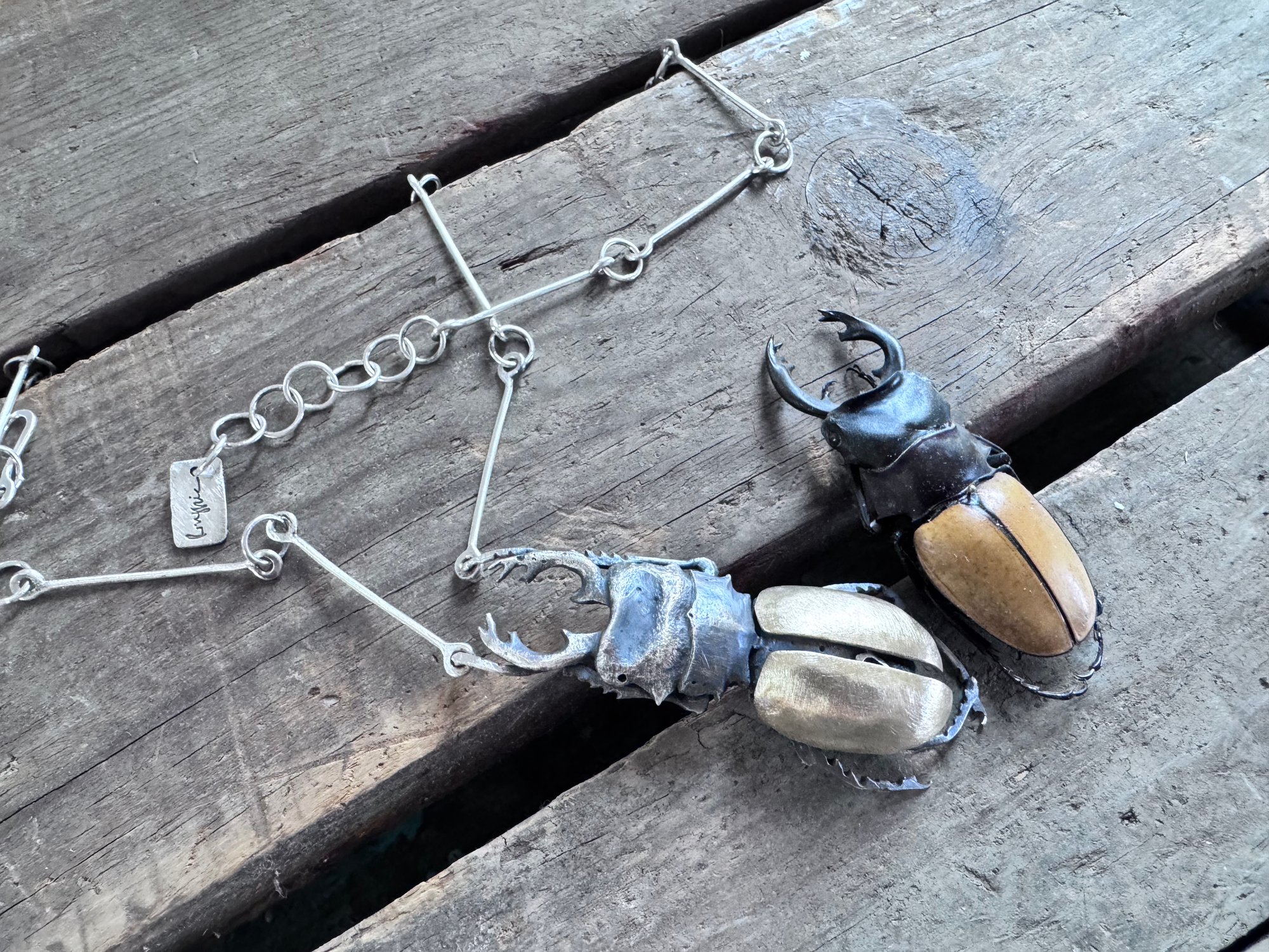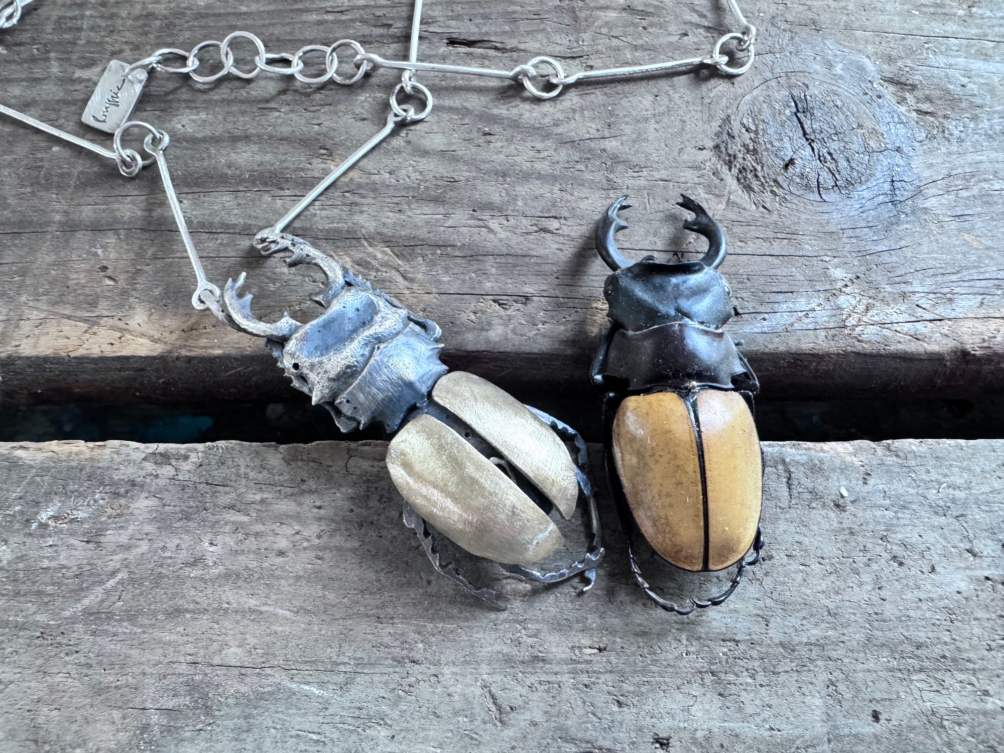 This rhinoceros beetle is hand formed sterling silver with brass wings. I made it by fusing recycled sterling silver which I then hand carved. Beneath the kinetic wings is the hand-sawed word "bold".