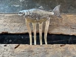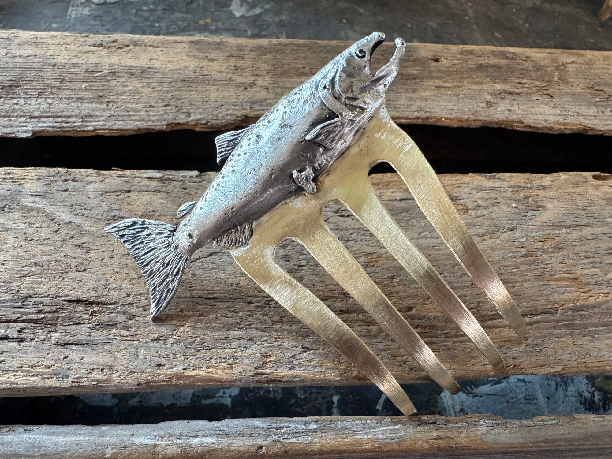 This should truly be an heirloom piece. The chinook is hollow formed sterling silver. I made it by fusing together a coil of sterling silver wire which I then hand carved. The fins are all sawed, carved and soldered into place.
