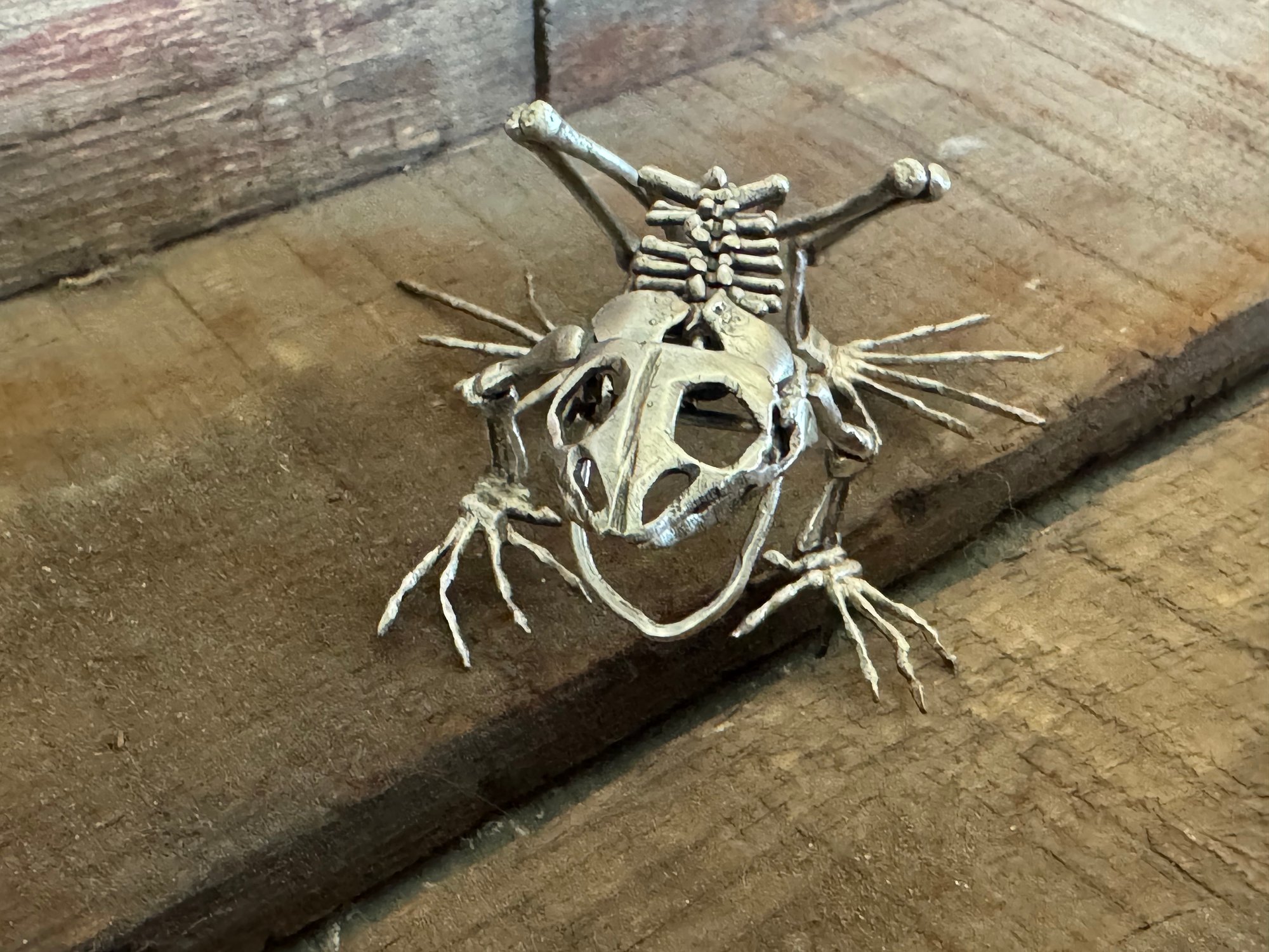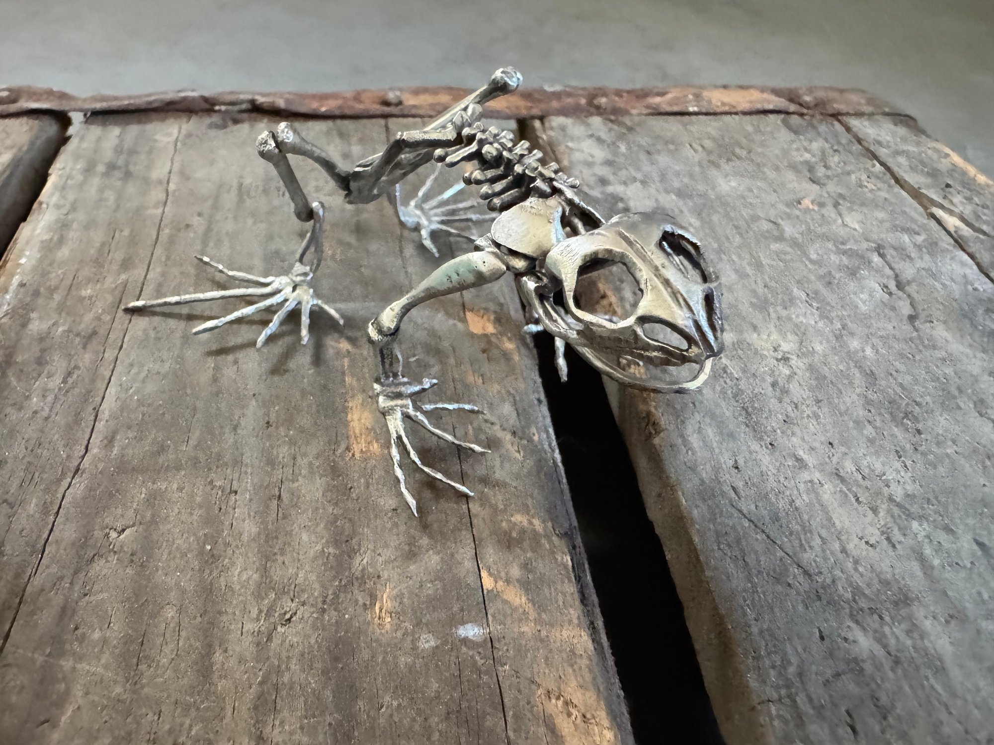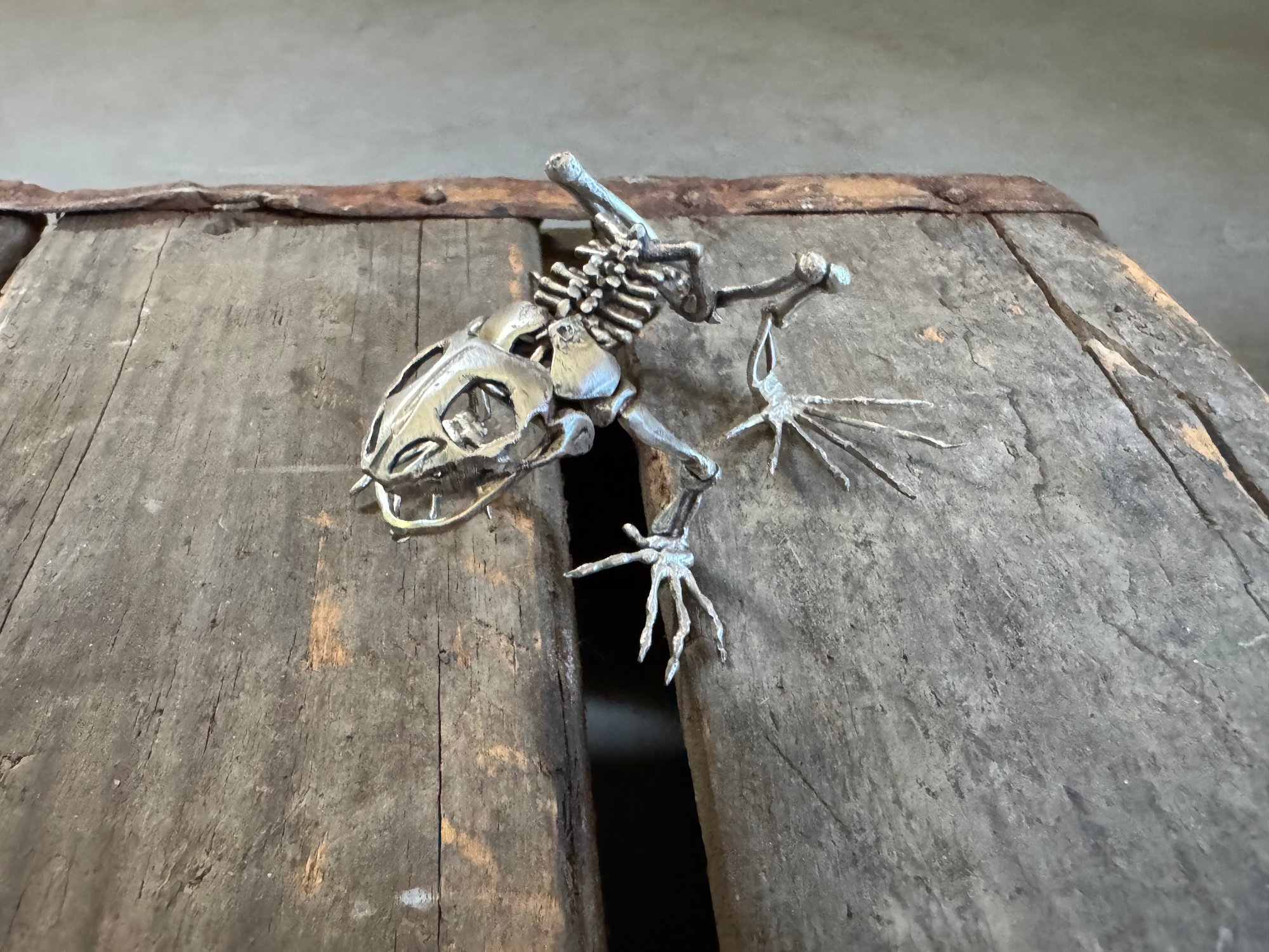 Flo, the Halloween Tree Frog disguised as a skeleton... is sterling silver. Techniques to make him included fusing, carving, and soldering. His jaw is kinetic.