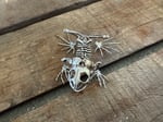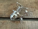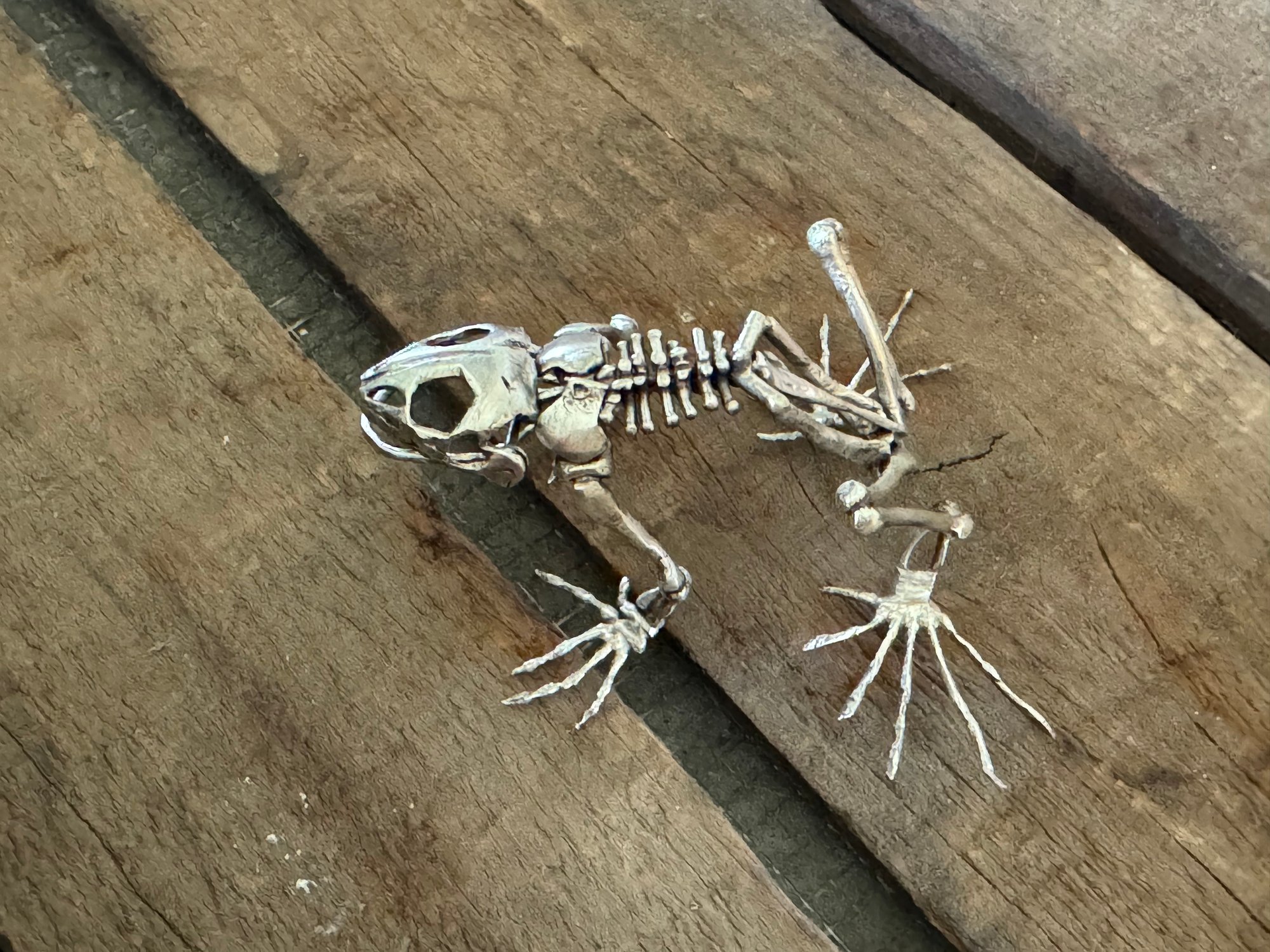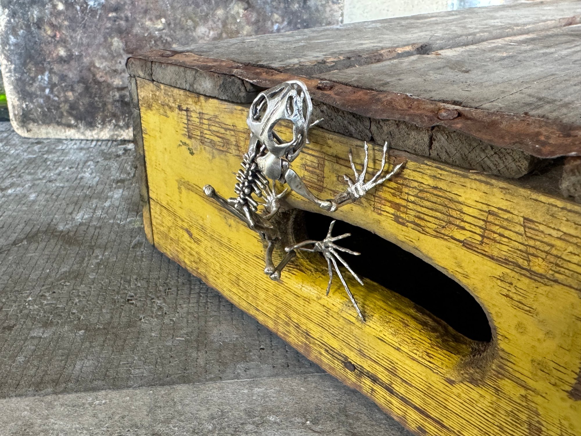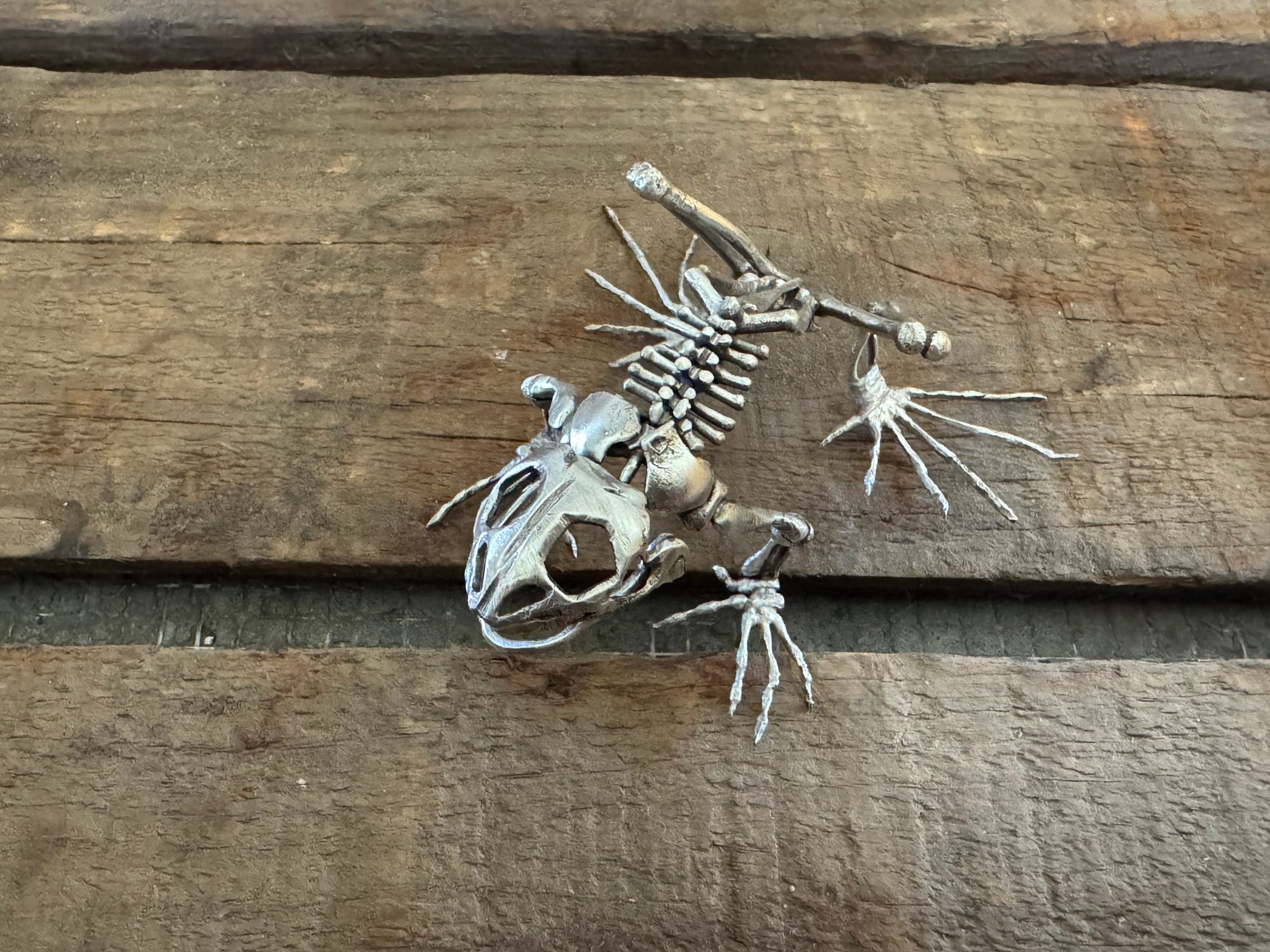 Flo, the Halloween Tree Frog disguised as a skeleton... is sterling silver. Techniques to make him included fusing, carving, and soldering. His jaw is kinetic.