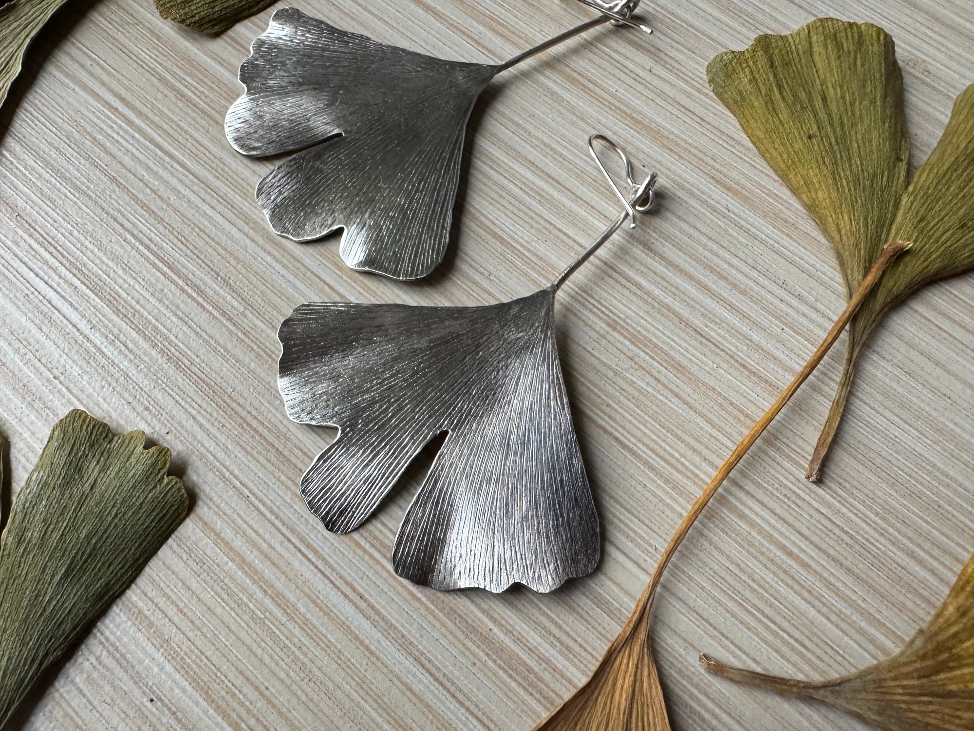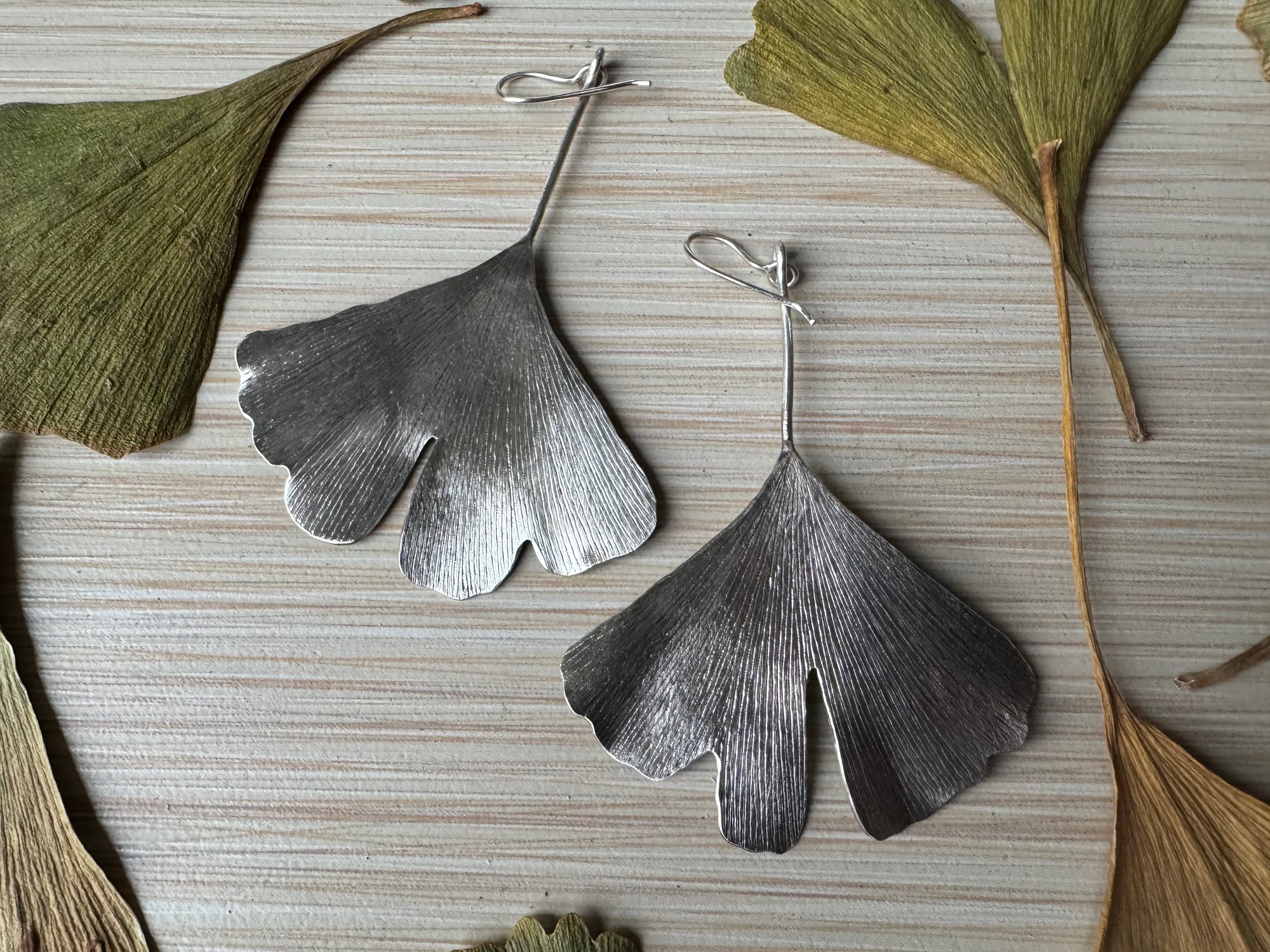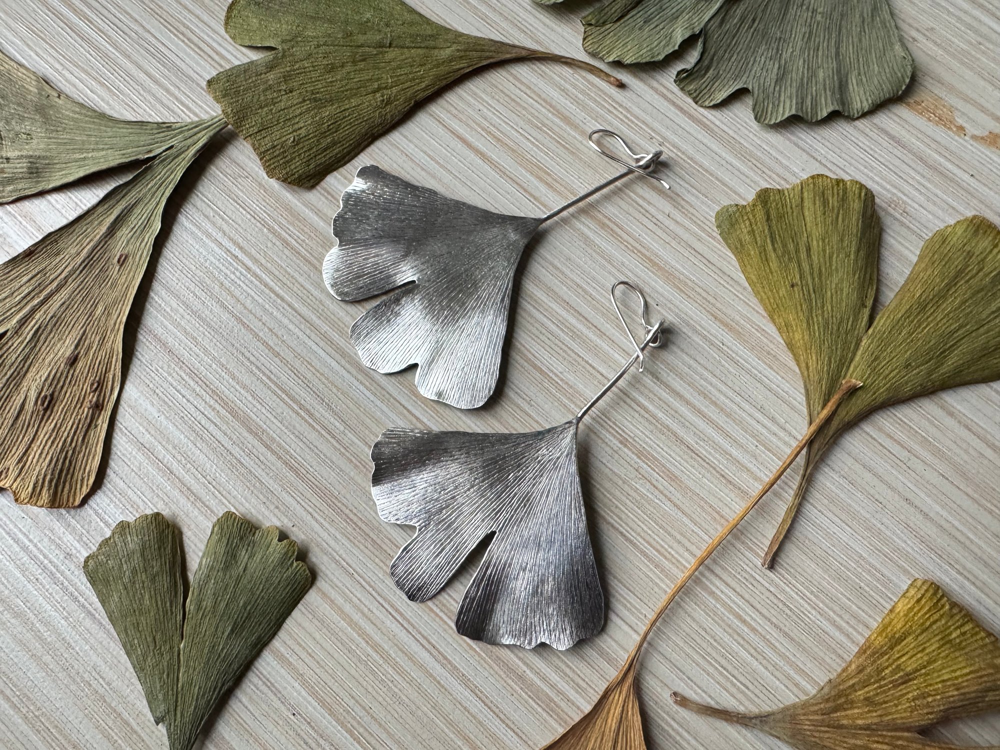 Hand sawed, carved and soldered, these sterling silver ginkgo earrings are one of a kind.