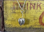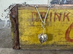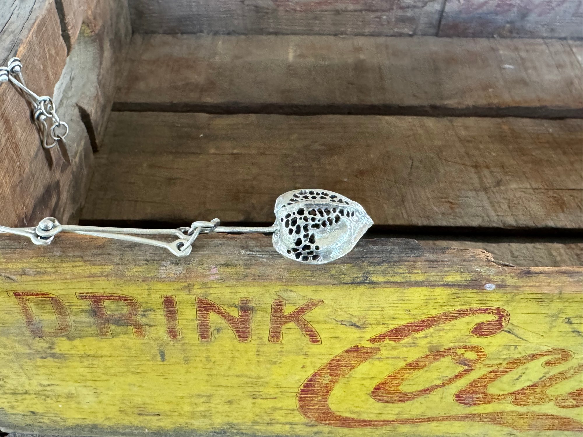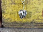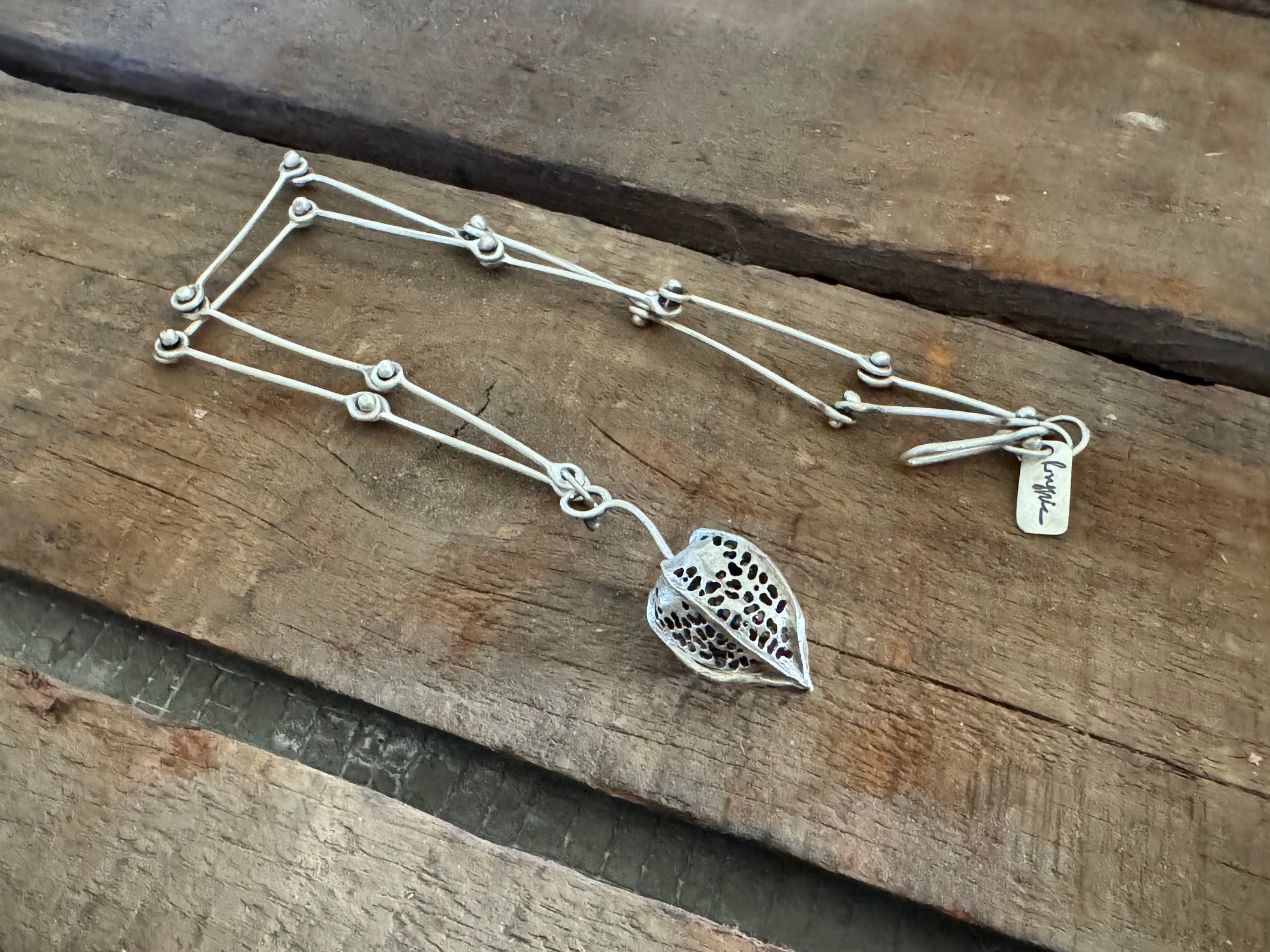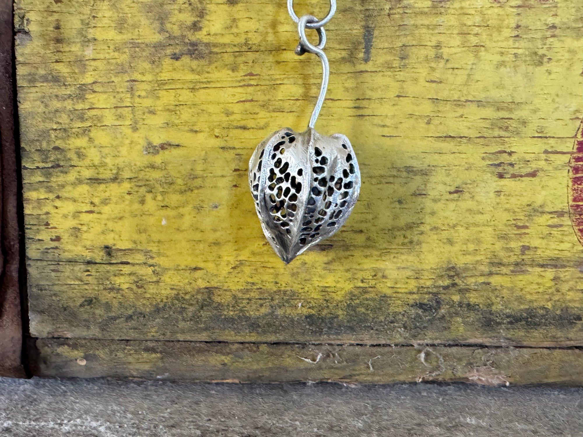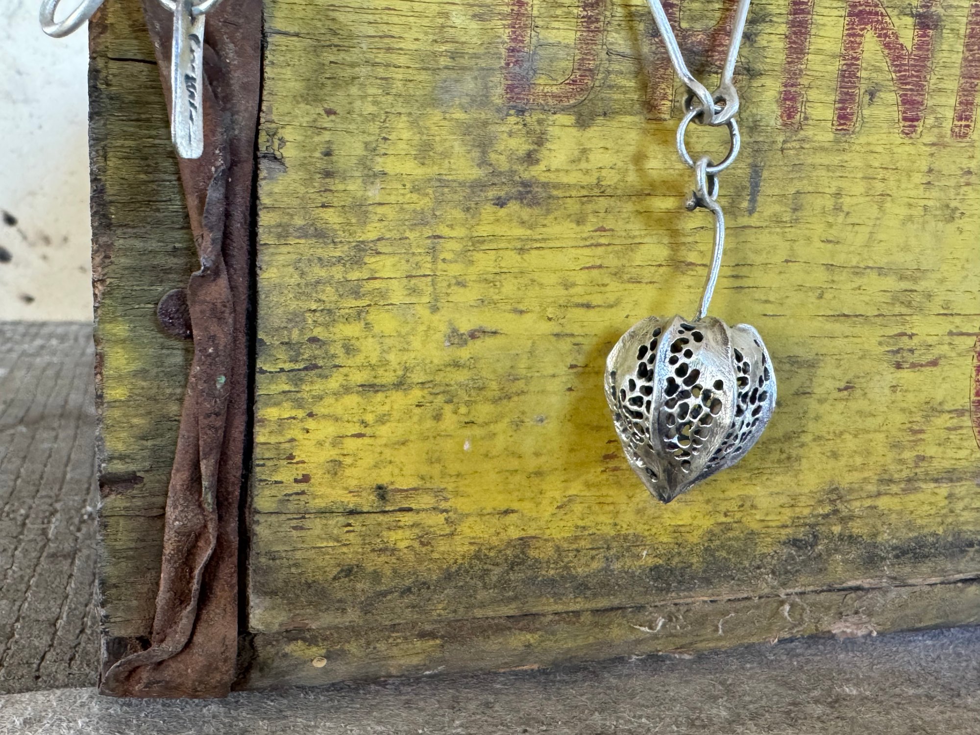 The pendant hangs 1.5" in length. The hand made chain is 19" in length. Sterling silver.