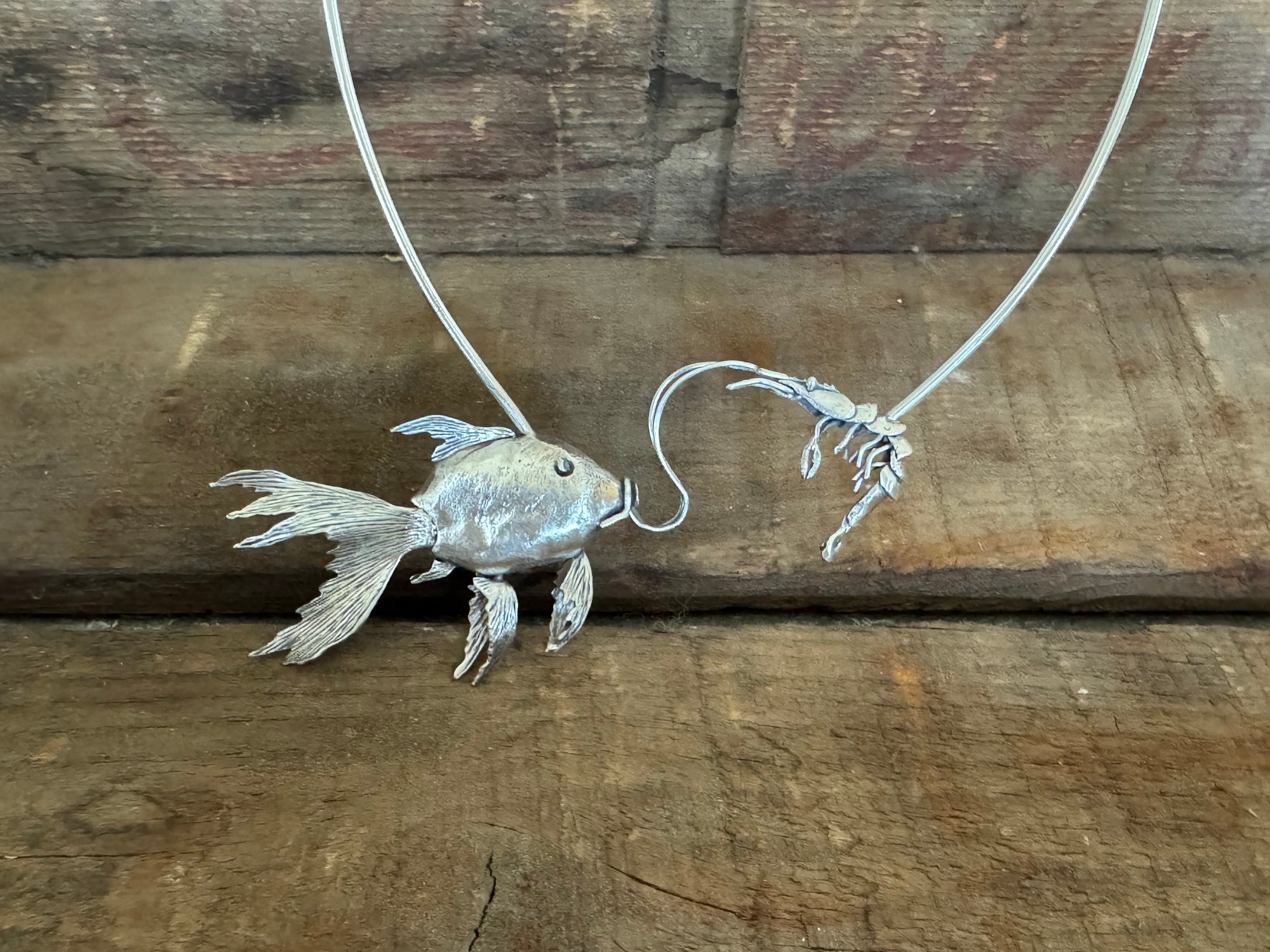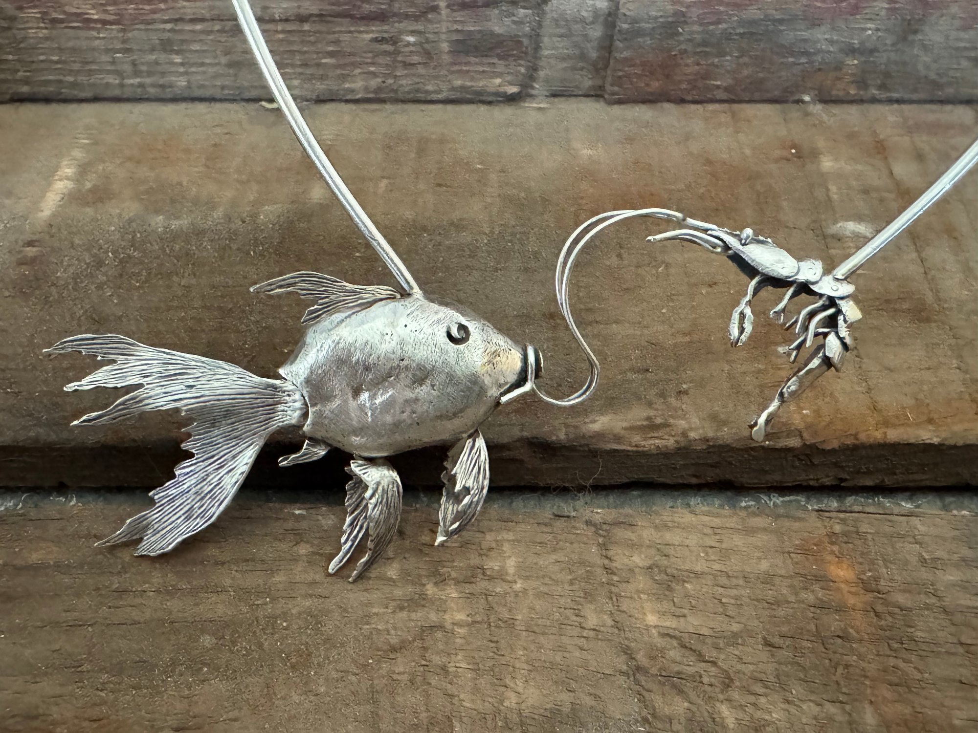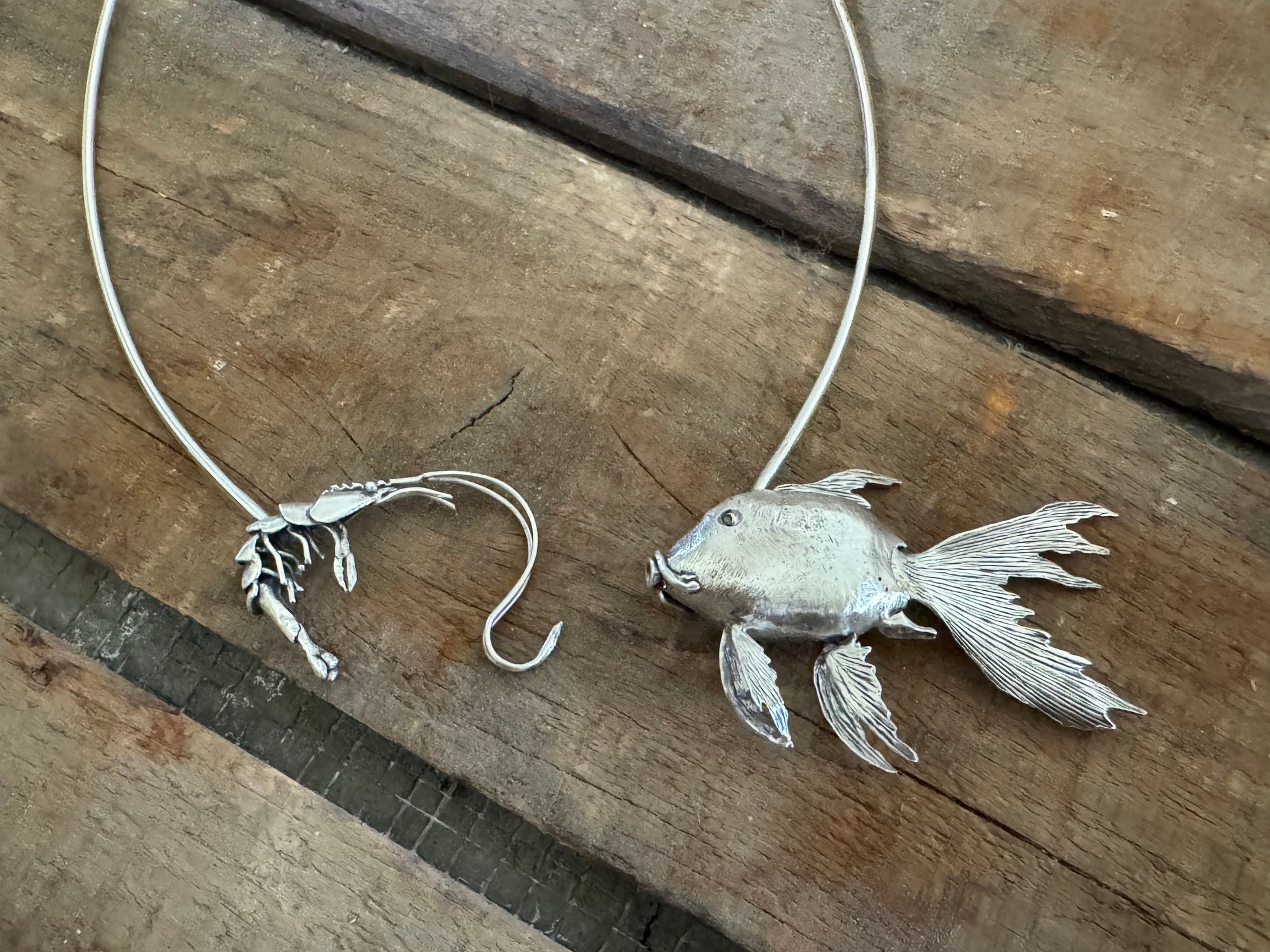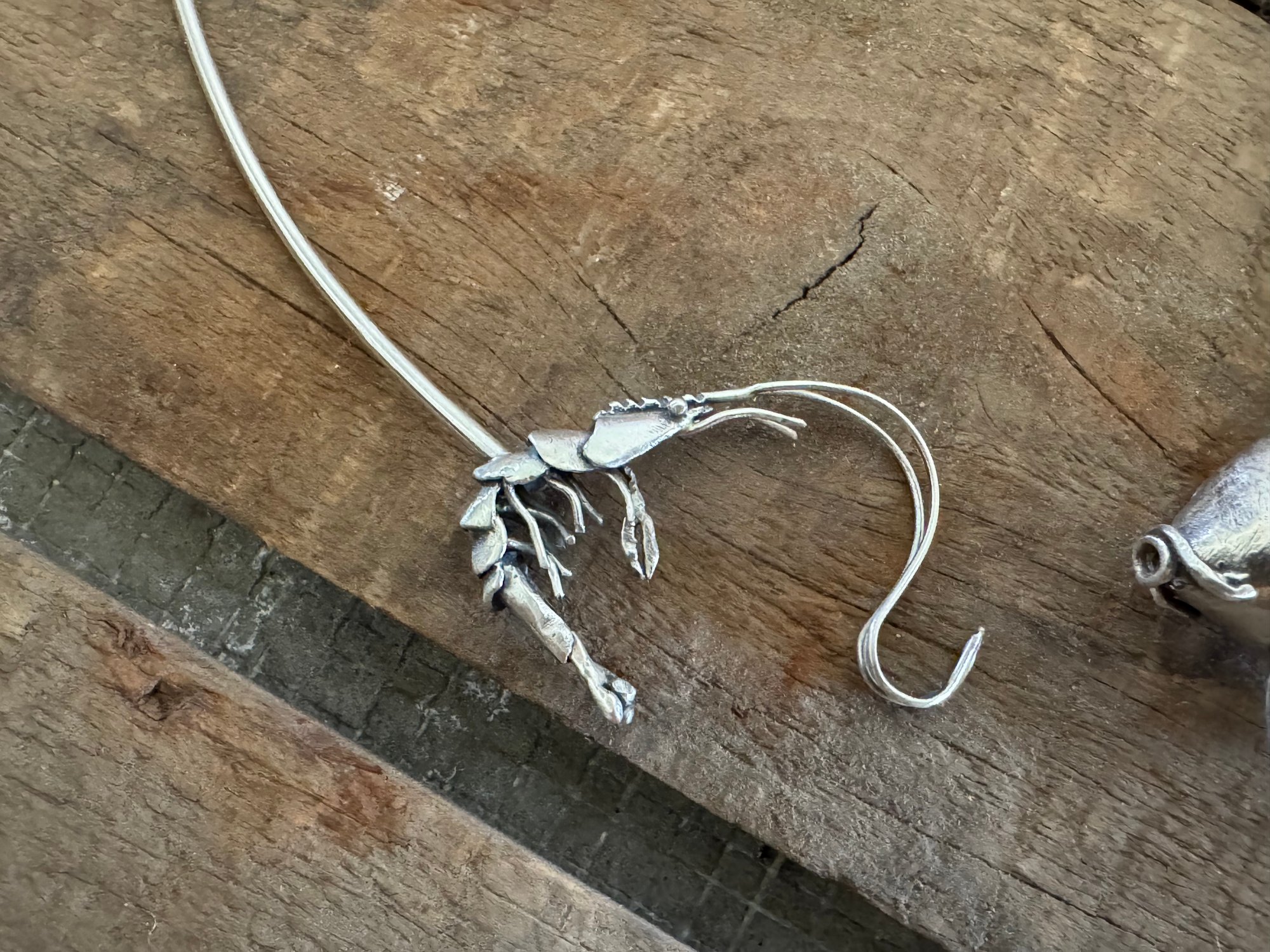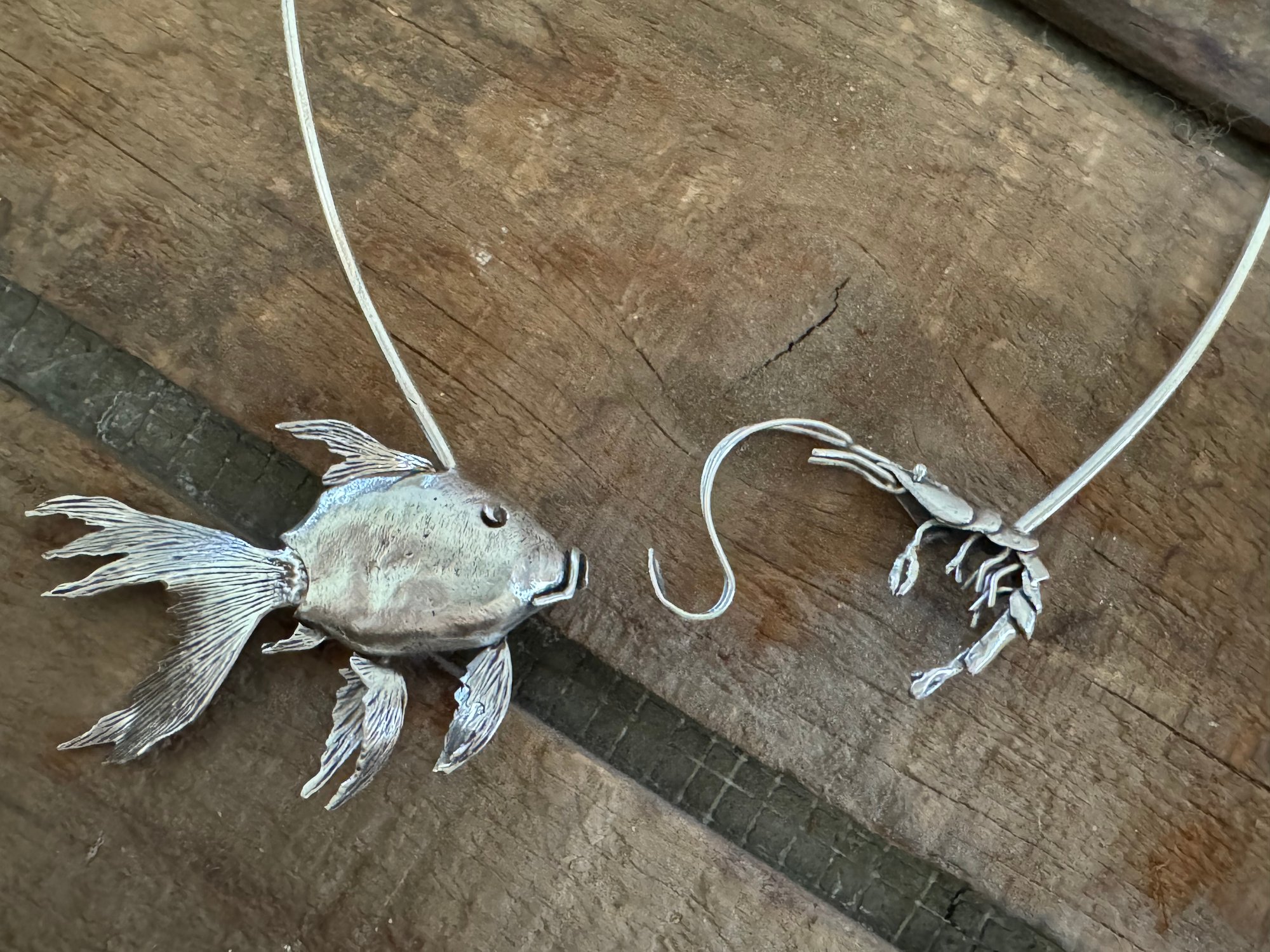Made with sterling silver. Both Kai and the shrimp are hand forged. Techniques included sawing, fusing, soldering, forming, and carving. Both are kinetic. Kai (the fish) is hollow. The shy shrimp has a head and tail that curl.