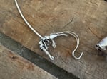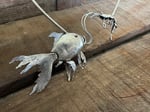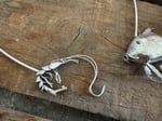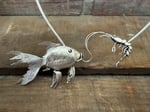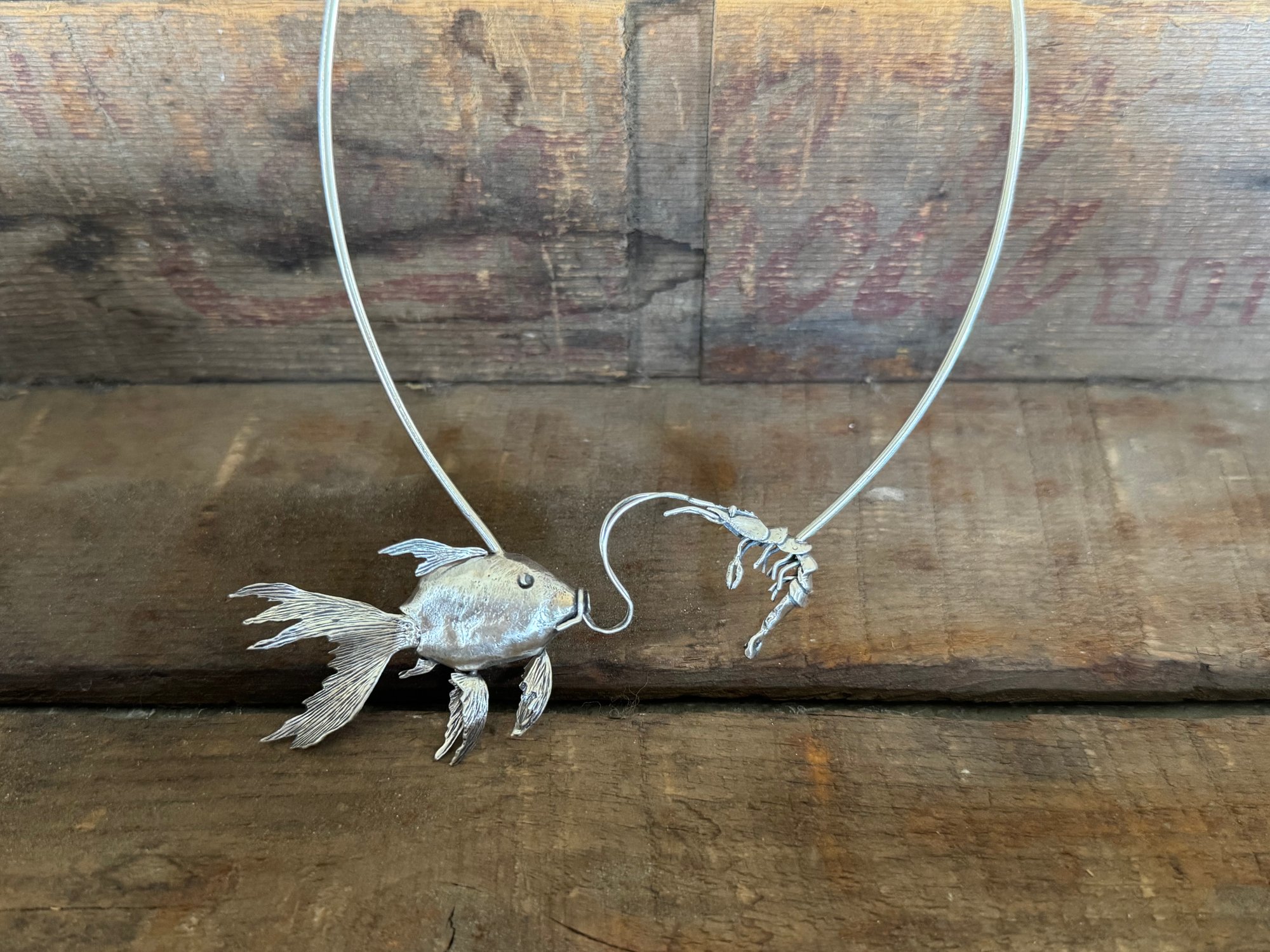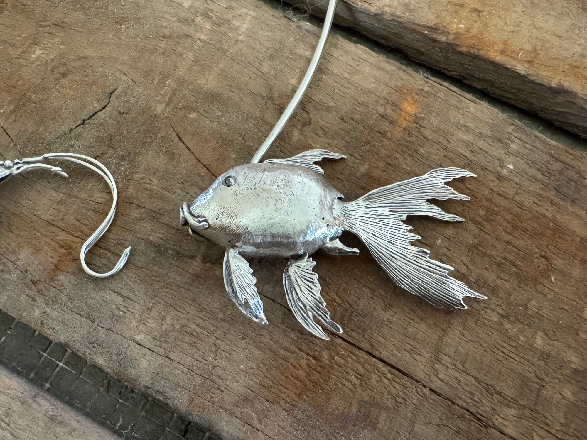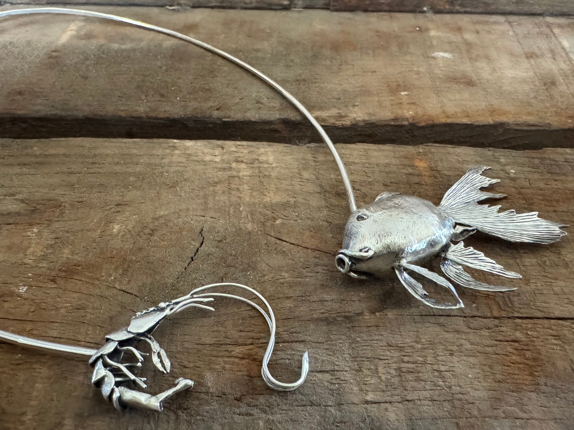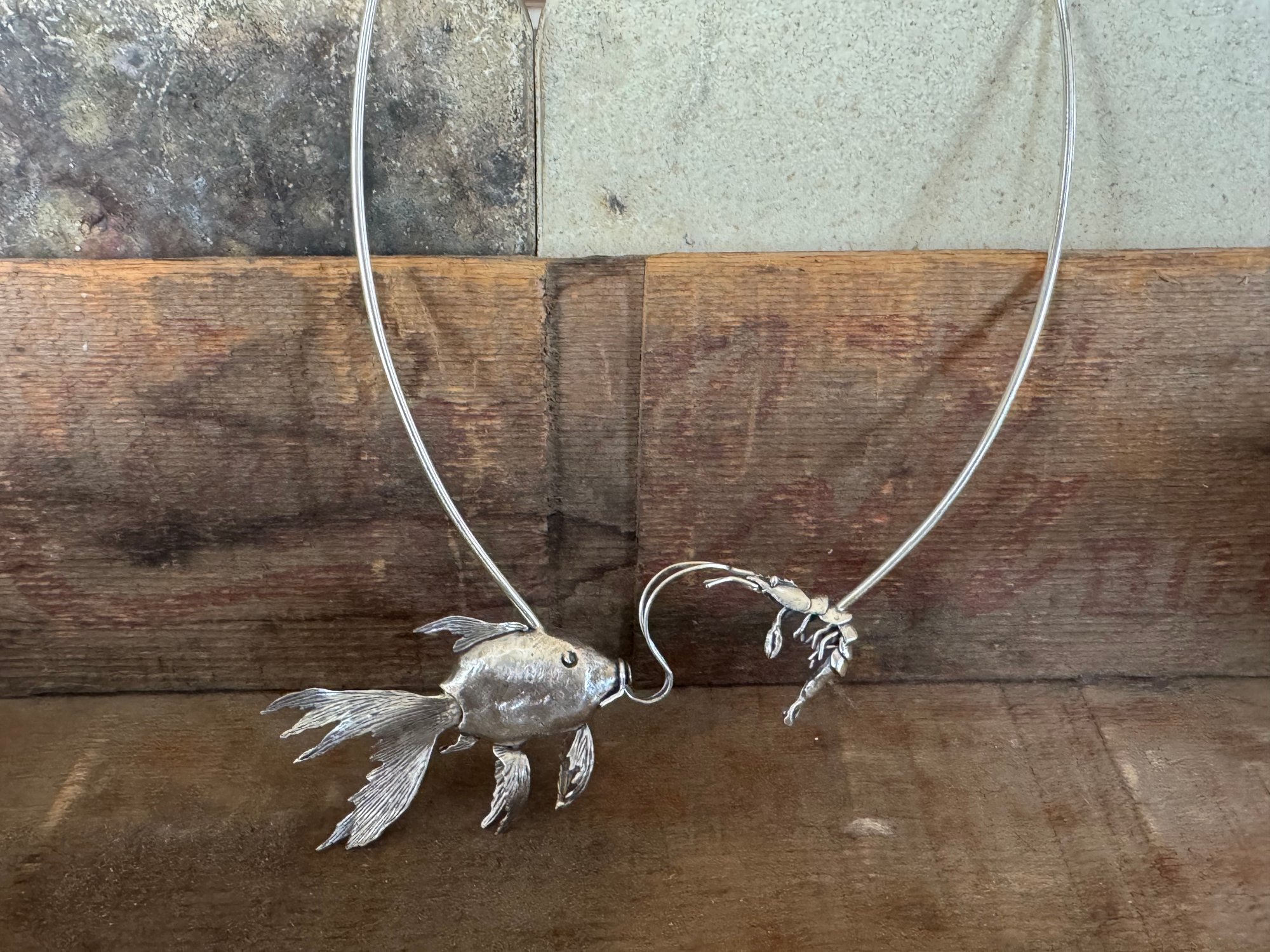 Made with sterling silver. Both Kai and the shrimp are hand forged. Techniques included sawing, fusing, soldering, forming, and carving. Both are kinetic. Kai (the fish) is hollow. The shy shrimp has a head and tail that curl.