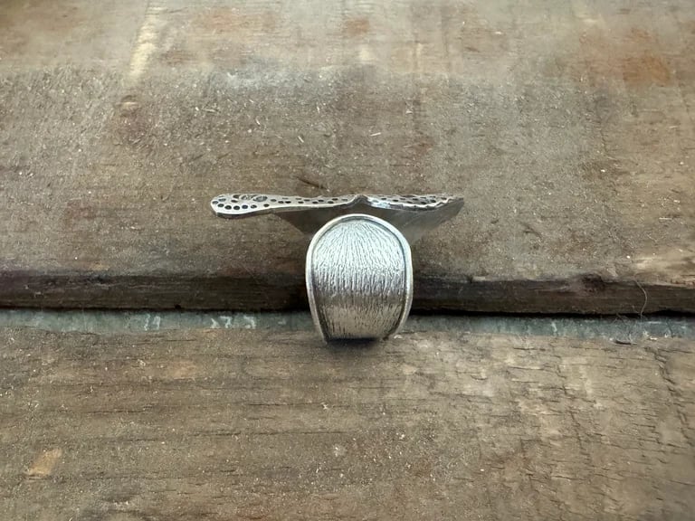 The wing is sawed, soldered, and formed. It's designed to be a statement piece, maybe worn best on longer fingers (although I have stubby fingers and I love wearing it since I prefer bolder statement pieces). The wing is 1.6" from top to bottom. The underside of the ring band is .3" wide.