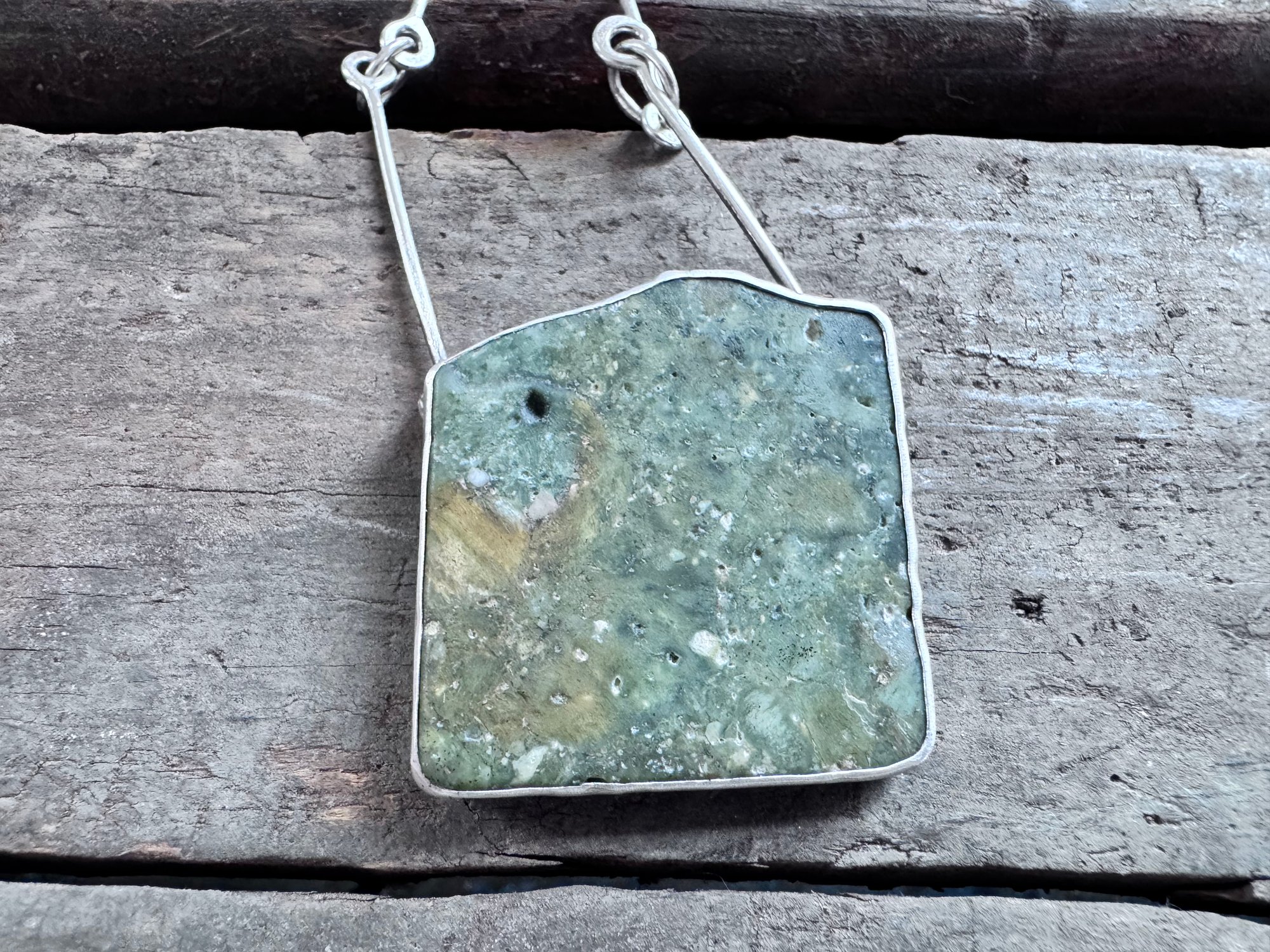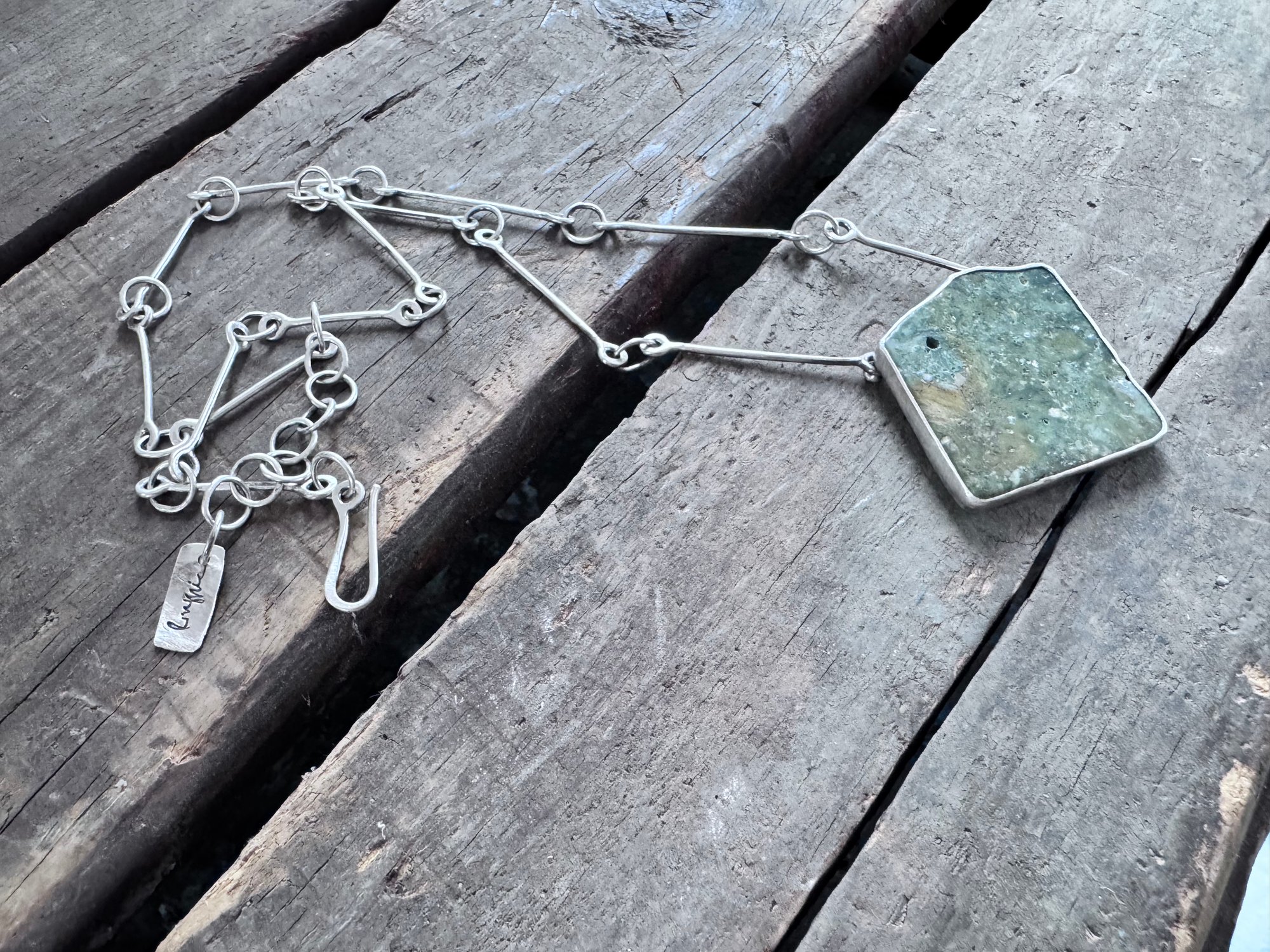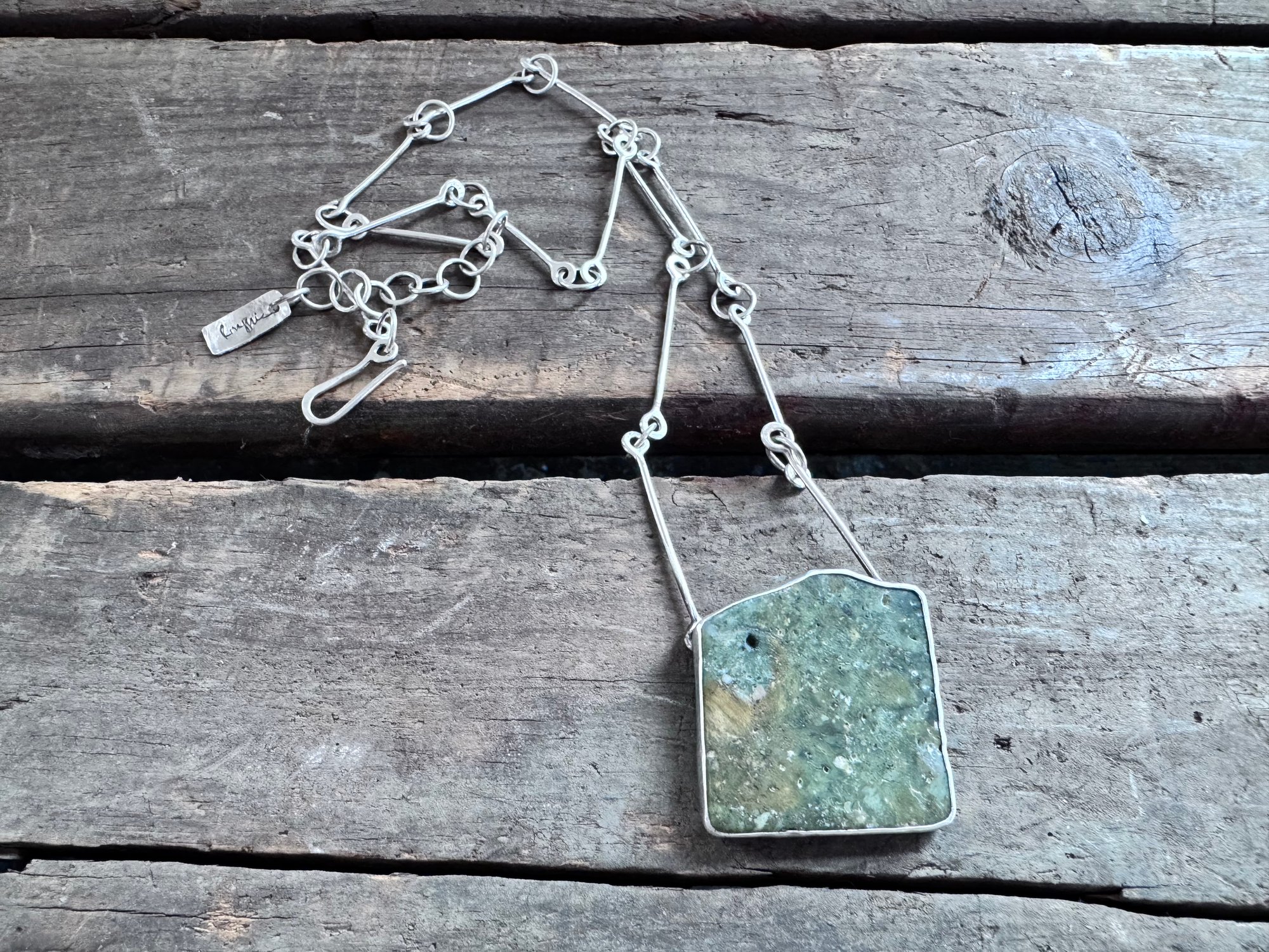 The hand made chain is sterling silver, 21-23". It is designed to be adjustable. The pendant is approximately 1.5" square.