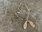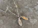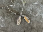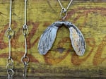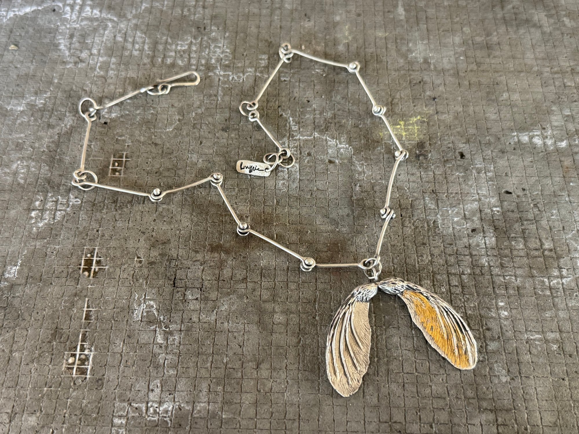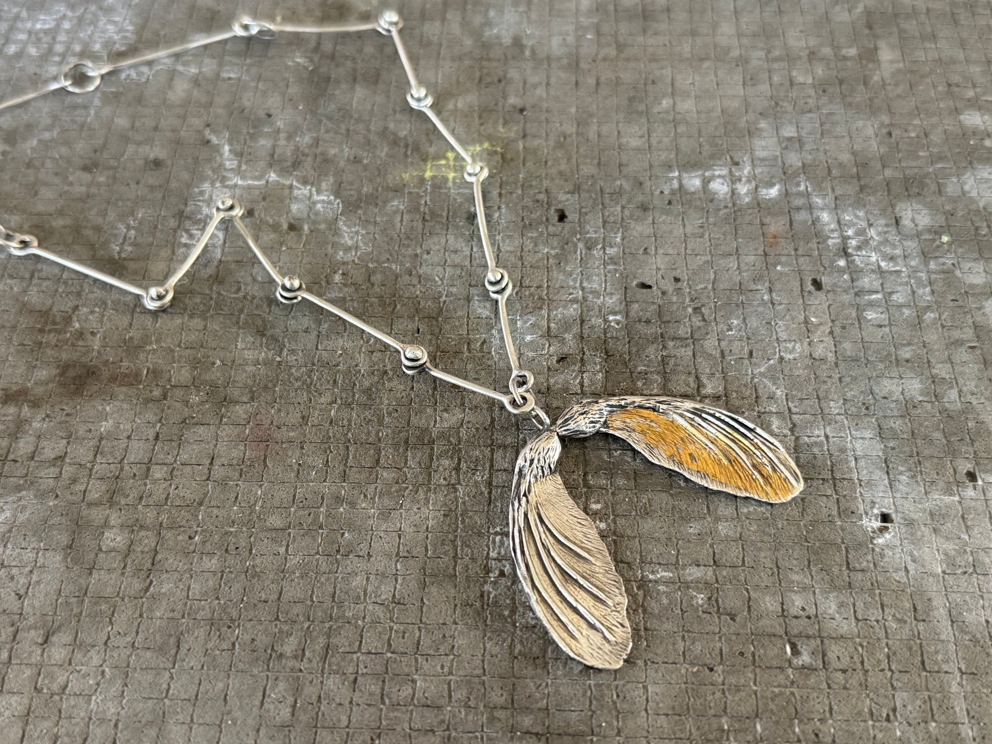 I fused, hand sawed, soldered, and formed these sterling silver maple seeds into a necklace. On the front face of the seeds I fused 18K gold (Keum Boo). The sterling silver chain is also hand fabricated and measures 18" in length.