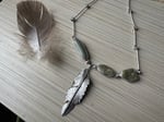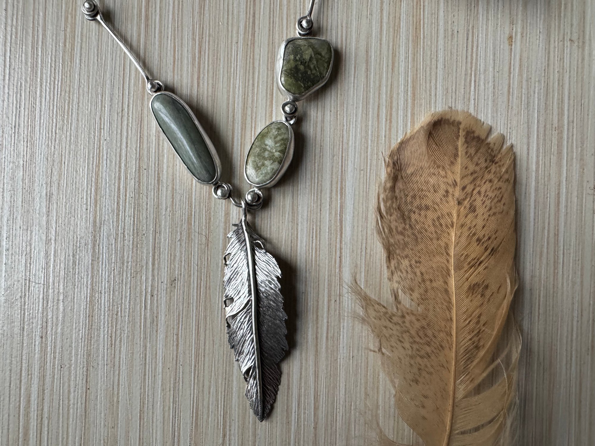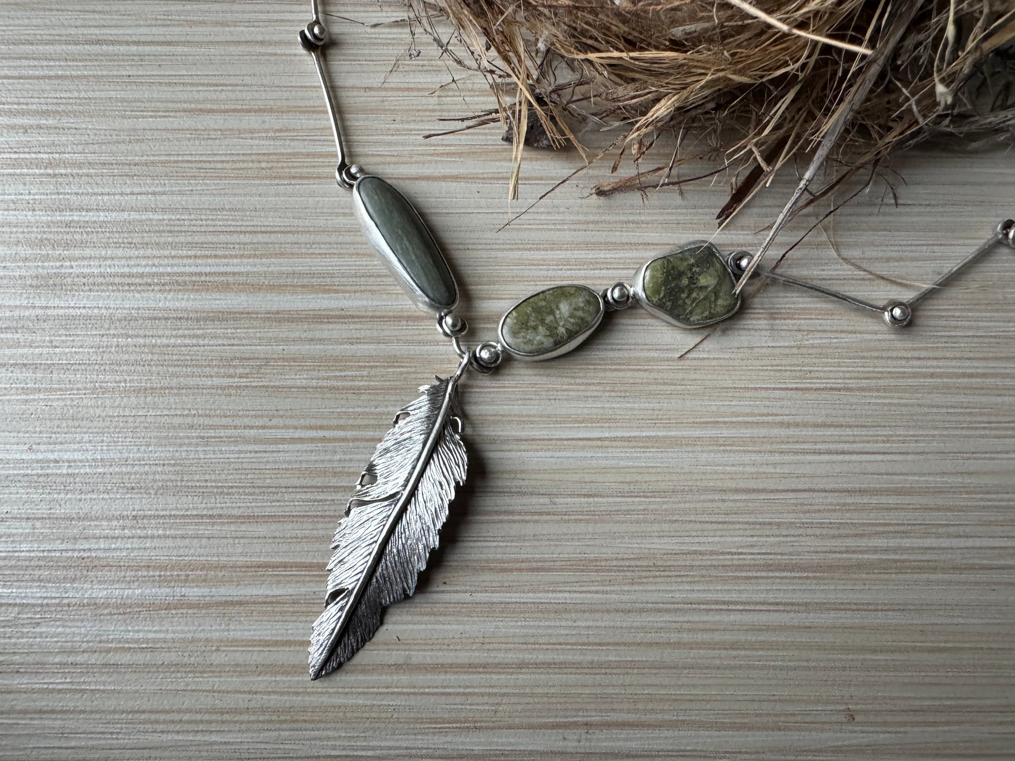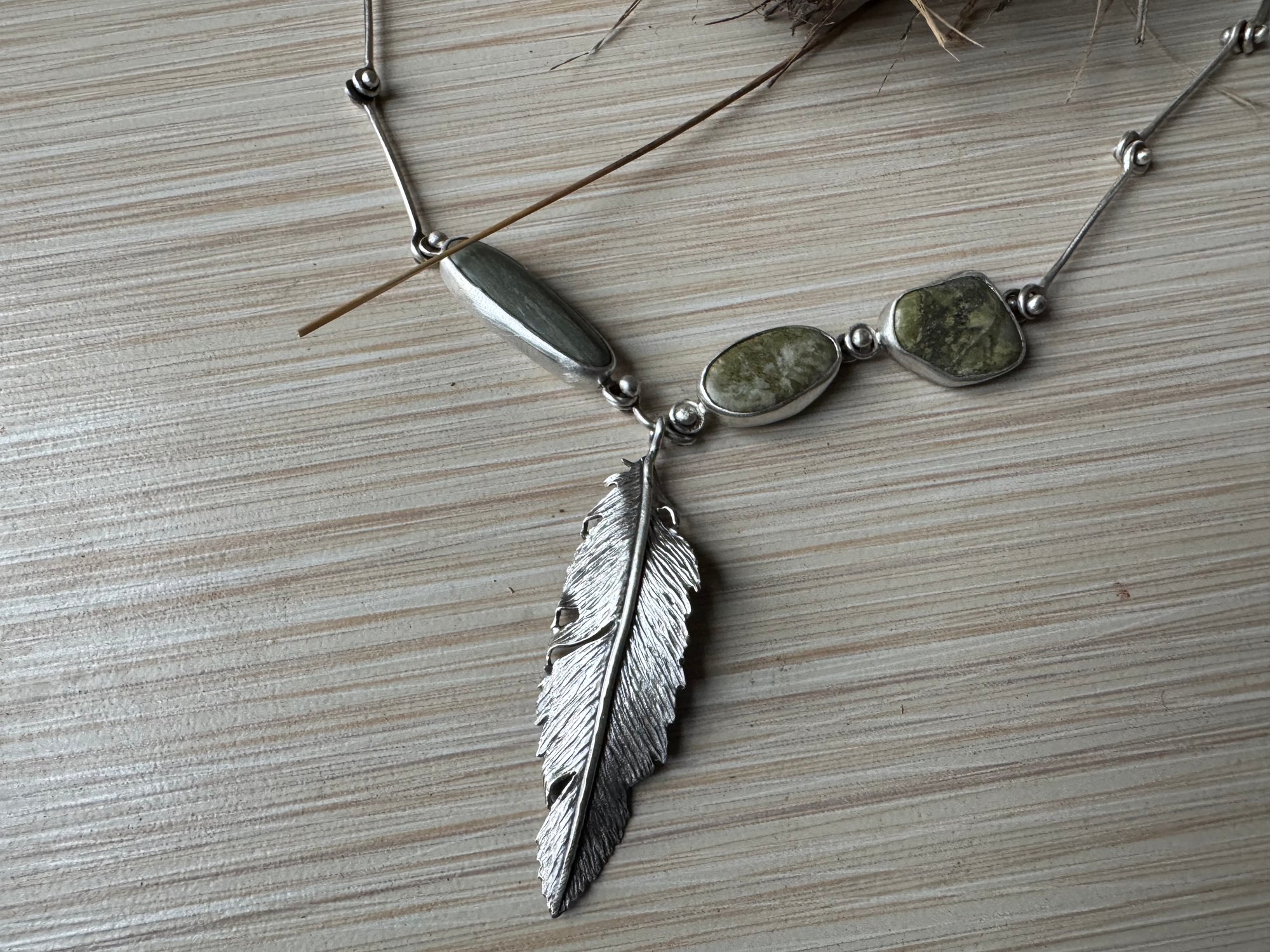 The feather hangs 2.5" in length. The chain, including the stones, measures 21" in length.
