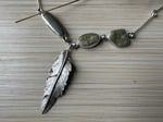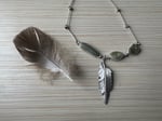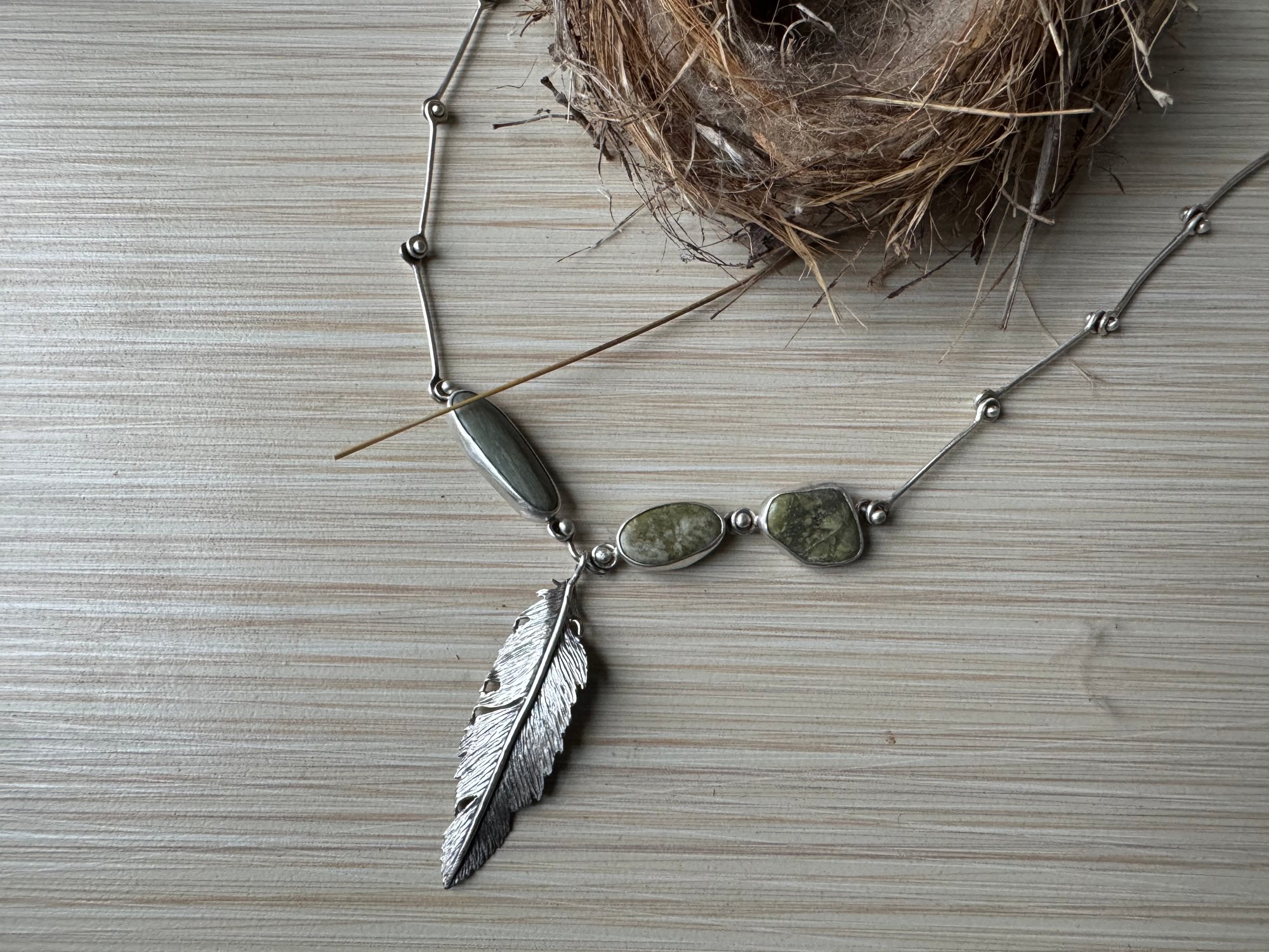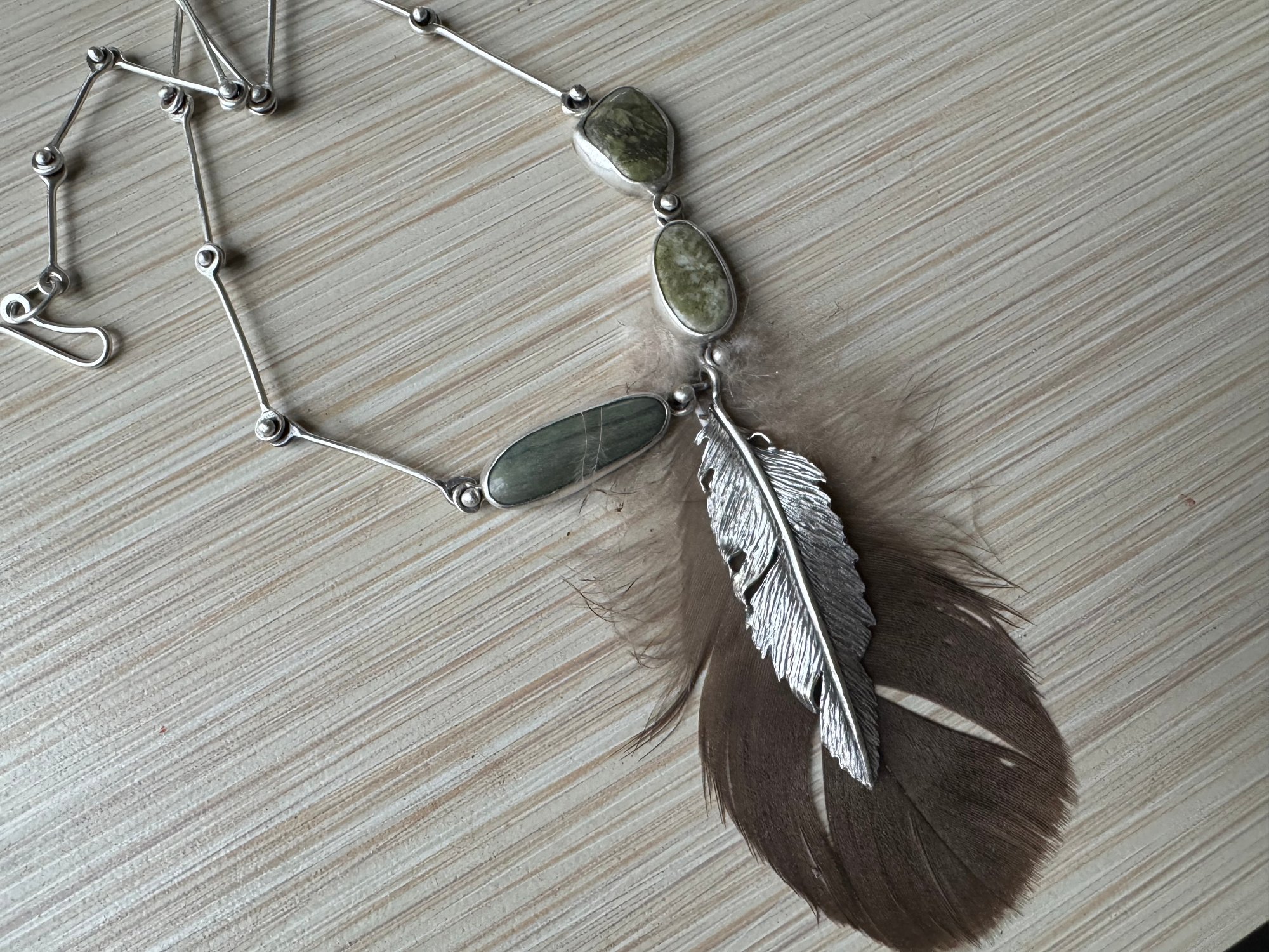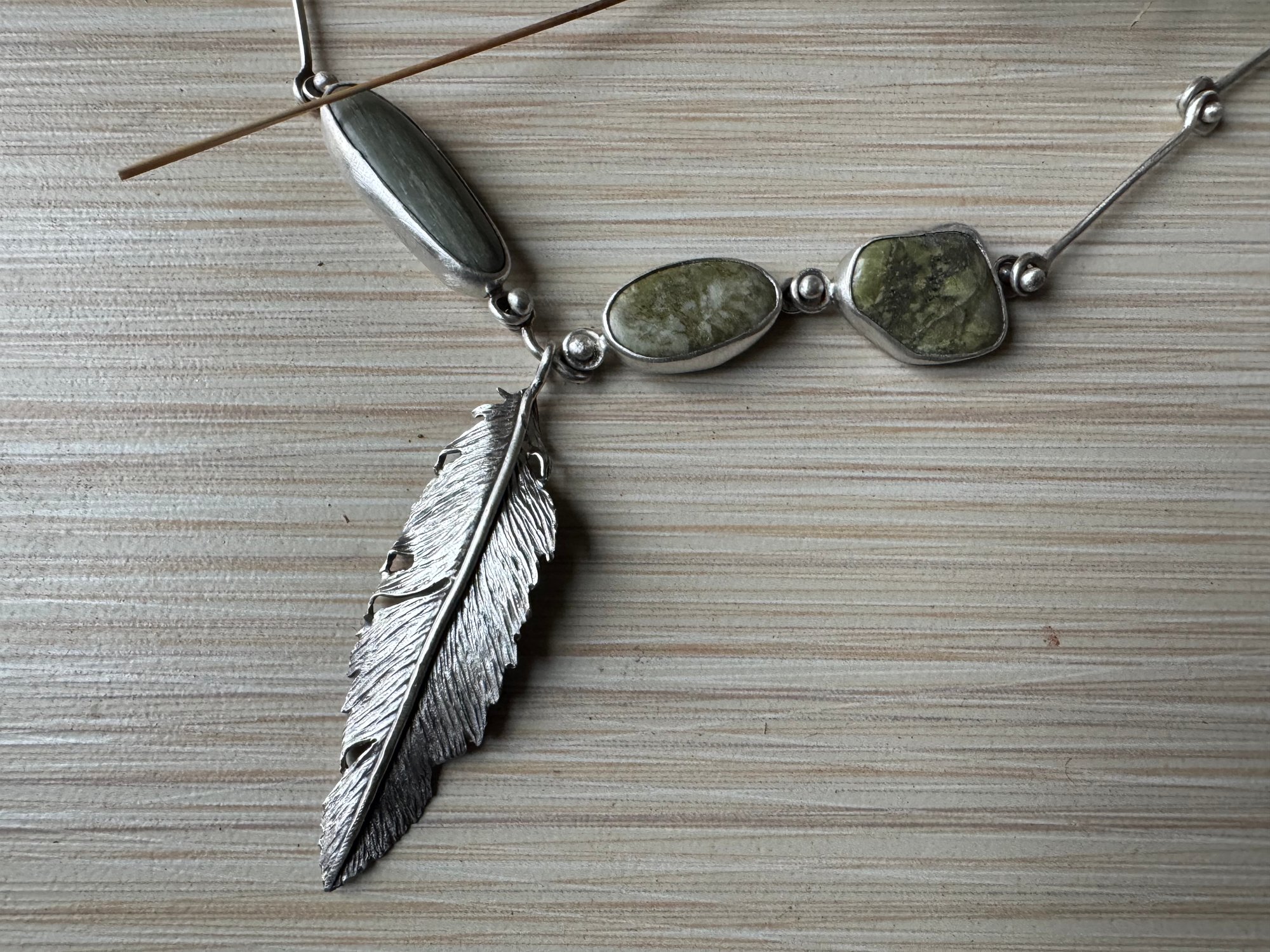 The feather hangs 2.5" in length. The chain, including the stones, measures 21" in length.