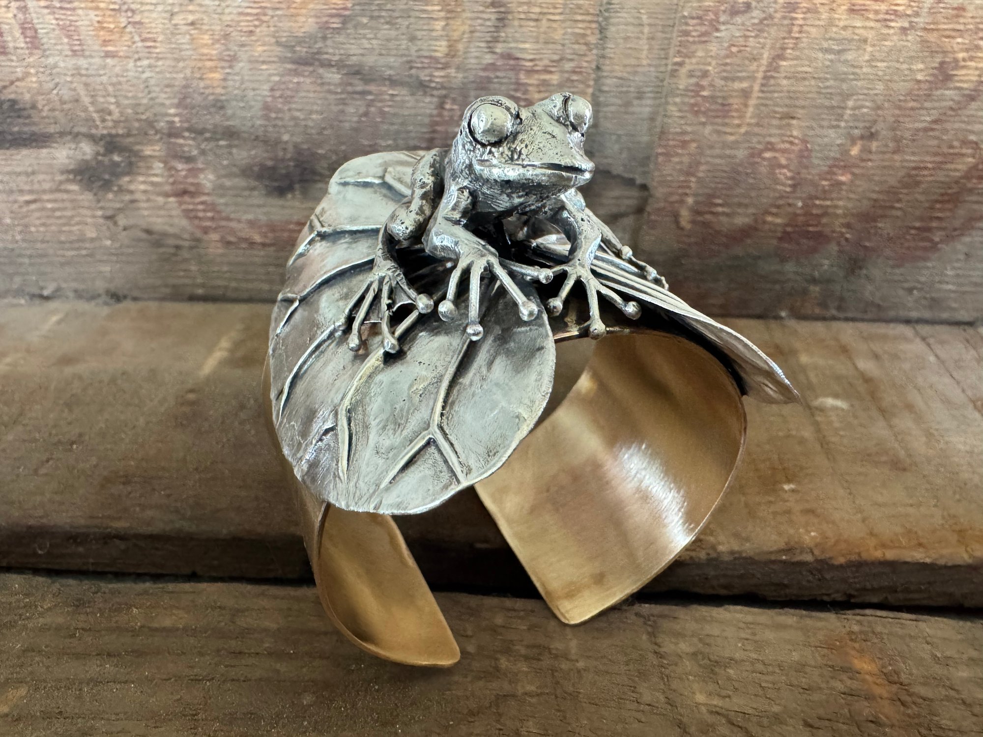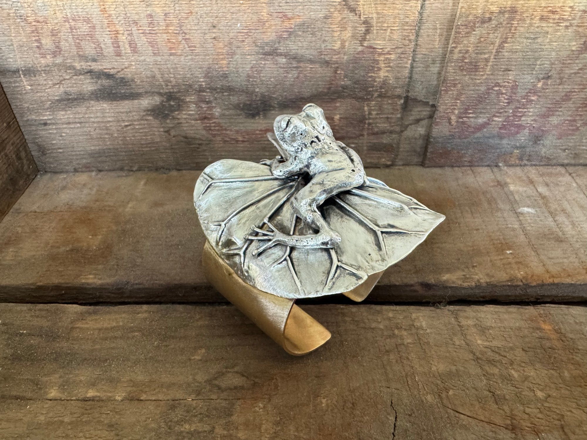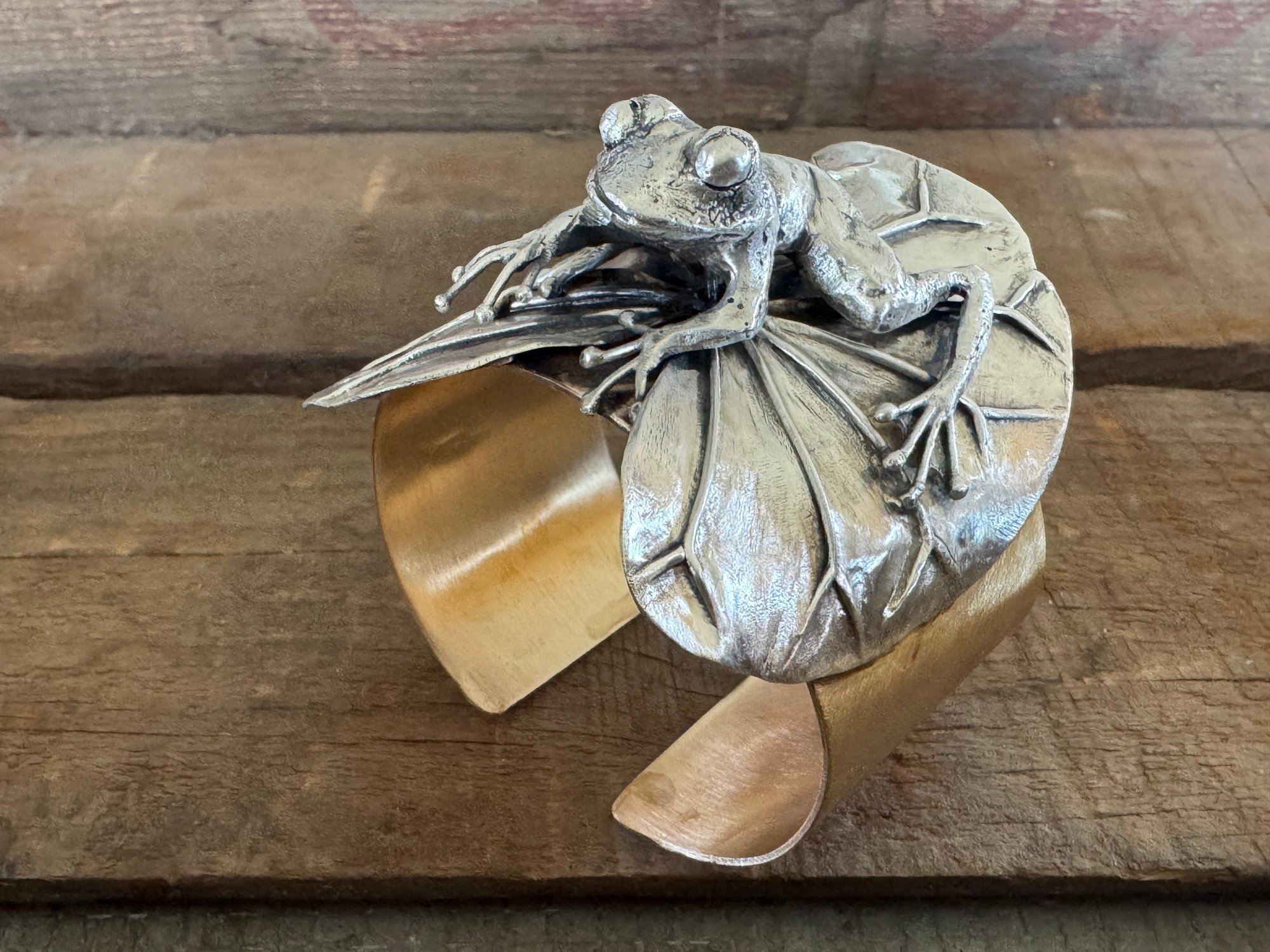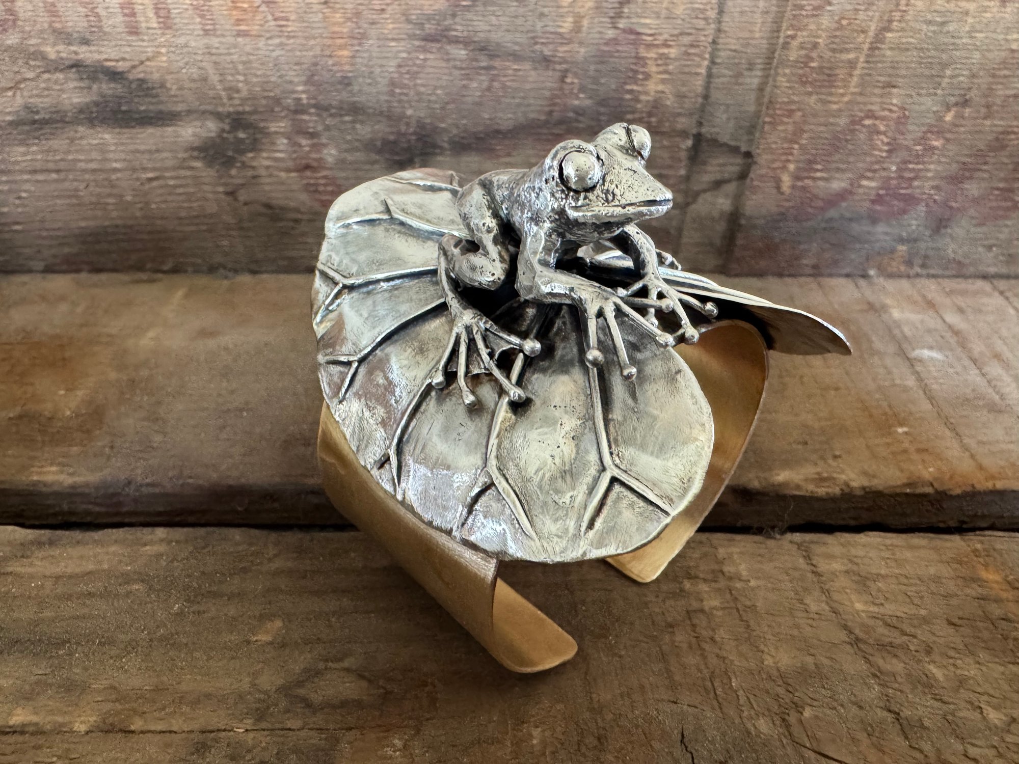 Made with brass and sterling silver. The frog is solid sterling, fused and hand carved. The lily pad is also sterling silver, which I soldered and hand formed with hammers and stakes.
