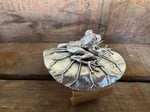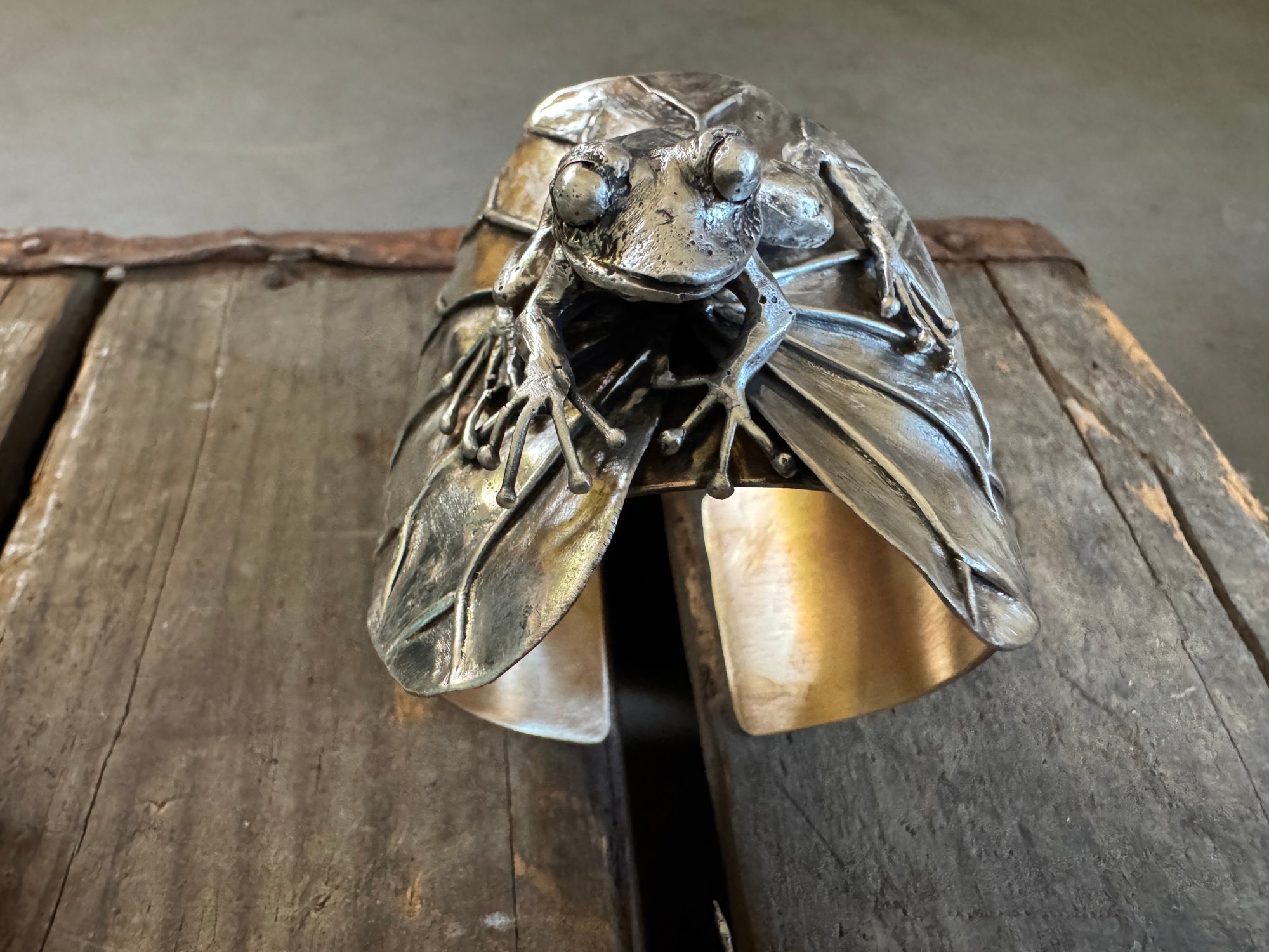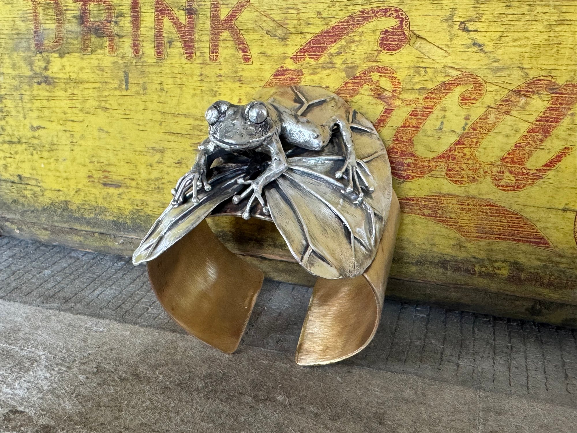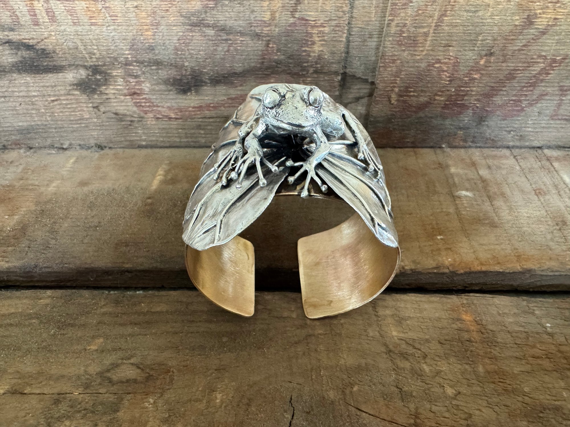Made with brass and sterling silver. The frog is solid sterling, fused and hand carved. The lily pad is also sterling silver, which I soldered and hand formed with hammers and stakes.
